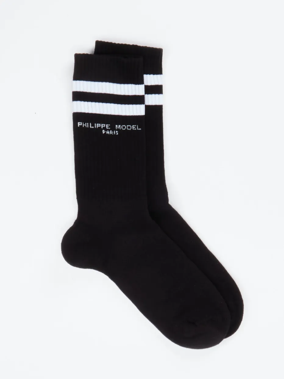 Die Unisex-Crew-Socken von Philippe Model verbinden sportlichen Retro-Stil mit funktionalem Komfort. Ideal für Athleisure-Outfits und entspannte Streetwear-Looks.