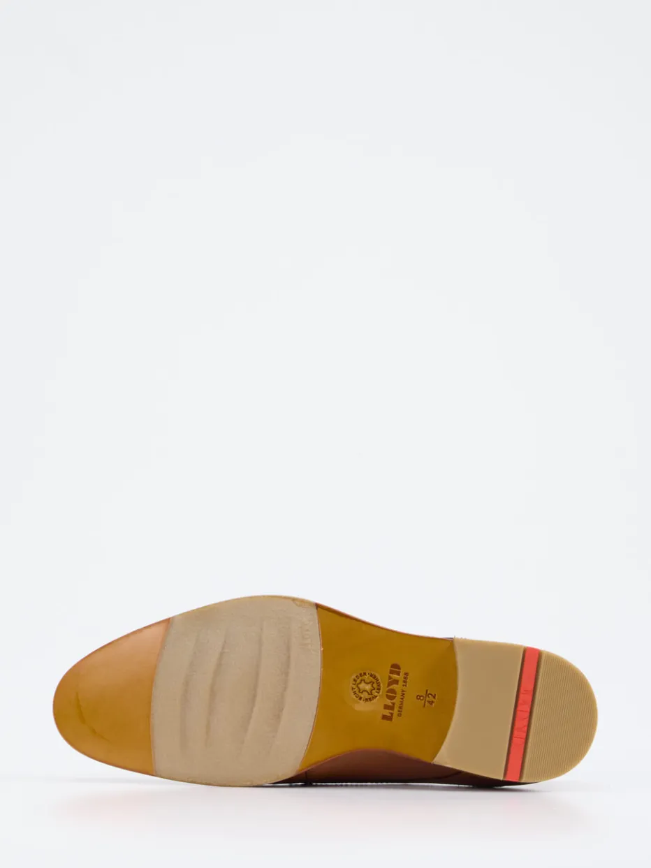 Business-Chic neu gedacht.Der Derby-Schuh von Lloyd verbindet klassische Linien mit einem Hauch Modernität. Im Büroalltag oder bei formellen Anlässen sorgt die klare Silhouette für einen stilvollen Eindruck. Das hochwertig verarbeitete Kalbleder zeigt sich teils genarbt und unterstreicht die mittelbraune Farbgebung mit Tiefe. Brogue-Details und ein farblich abgesetzter Gummistreifen im Absatzbereich setzen dezente Akzente. Die Laufsohle aus Leder mit Gummi-Einsatz vereint Eleganz mit Funktionalität. Ideal für klassische und Business-Casual-Kombinationen – zum Beispiel mit navyfarbener Stoffhose. Lloyd garantiert hochwertige Verarbeitung mit Sinn für klassischen Stil.