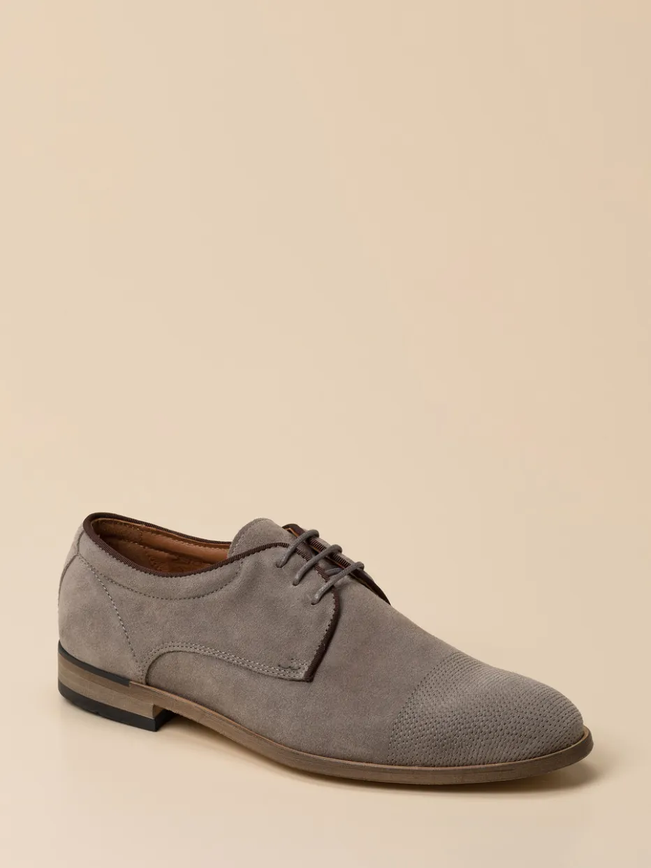 Im grauen Veloursleder mit samtig-matter Struktur zeigt der Schnürschuh seine hochwertige Verarbeitung. Die geprägte Kappe sowie tonige Nähte und eine braune Kantenpaspelierung setzen dezente Highlights. Klassisch-flach in der Silhouette, innen mit Kalblederfutter und bequemem Fußbett ausgestattet – ideal für Geschäftstermine oder elegante Freizeitkombinationen. Der Look greift aktuelle Trends wie „Quiet Luxury“ und „Soft Neutrals“ auf und lässt sich stilvoll mit beigefarbener Chino und grauem Gürtel ergänzen.
