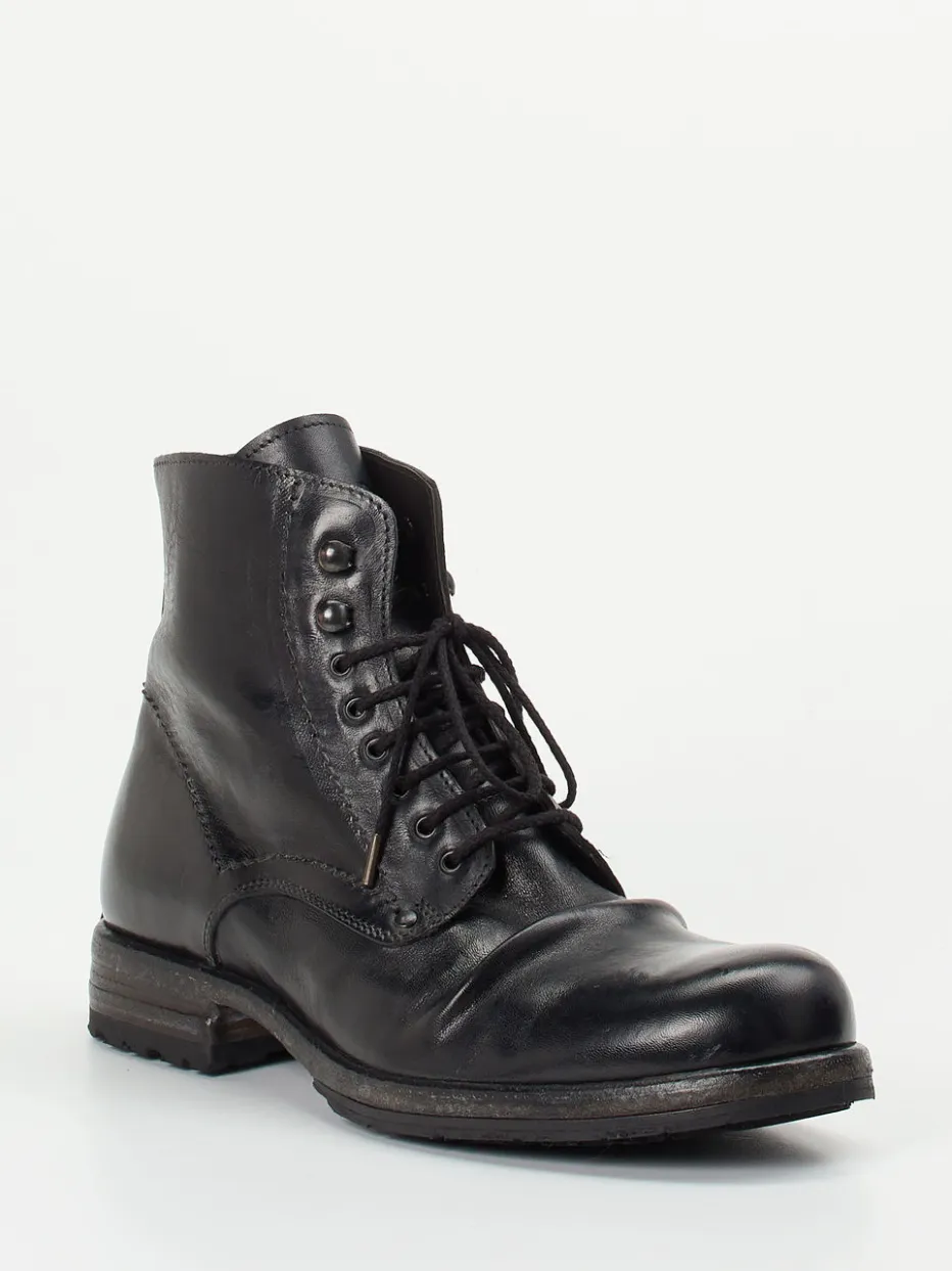 Ideal für kühle Tage in der Stadt oder stilvolle Wochenendausflüge: Der schwarze Schnürboot überzeugt durch glänzendes Pferdeleder mit charakteristischen Querfalten am Rist. Schwarze Metallösen mit markanter Haken-Ösen-Schnürung unterstreichen den Heritage-Look. Die durchgenähte Ledersohle mit Gummiprofil sorgt für Trittsicherheit und Langlebigkeit. Inspiriert von Workwear und Militärstil, bleibt der Look klassisch-modern. Lässt sich hervorragend zu Raw Denim oder Wollhose kombinieren.