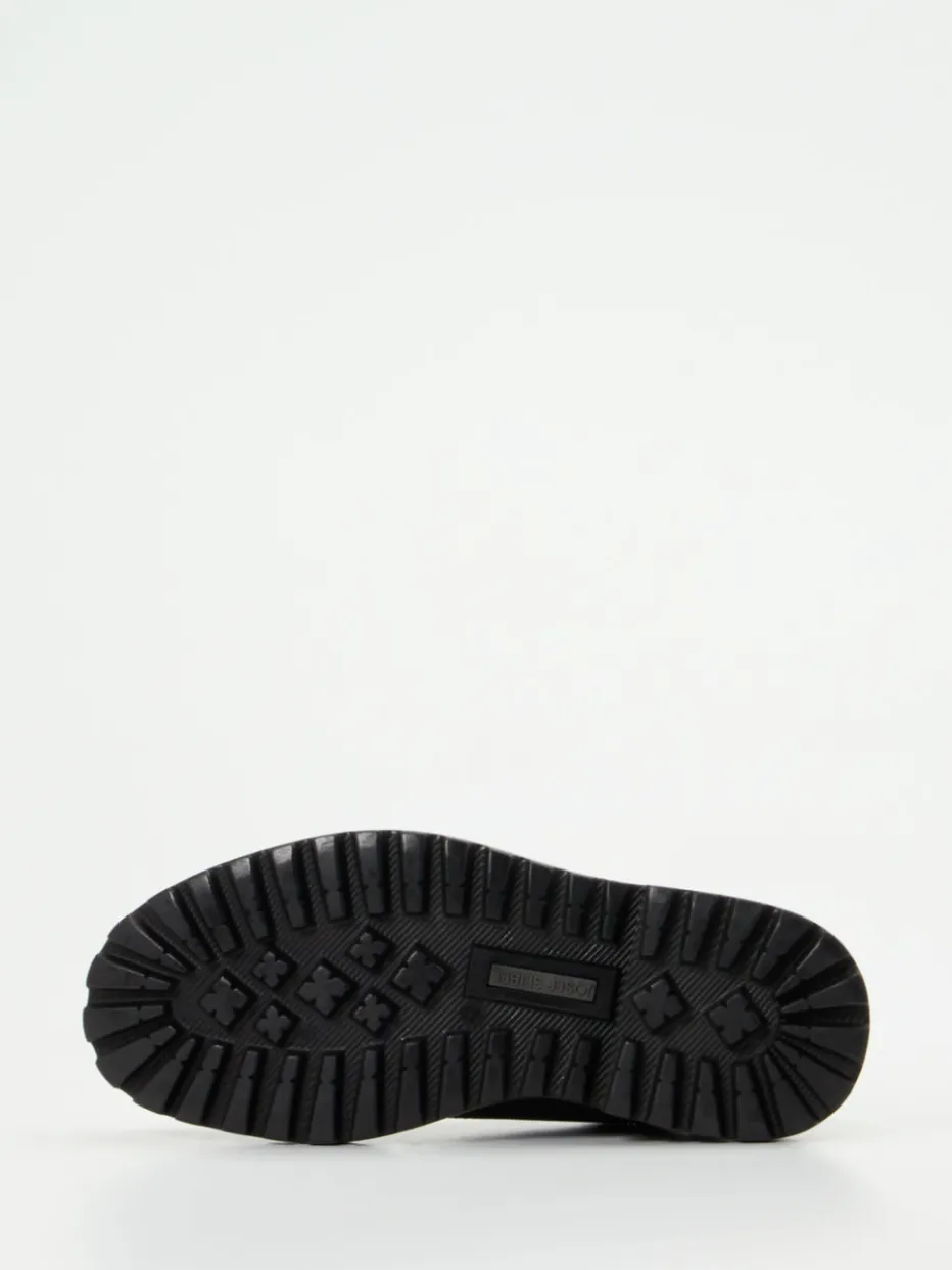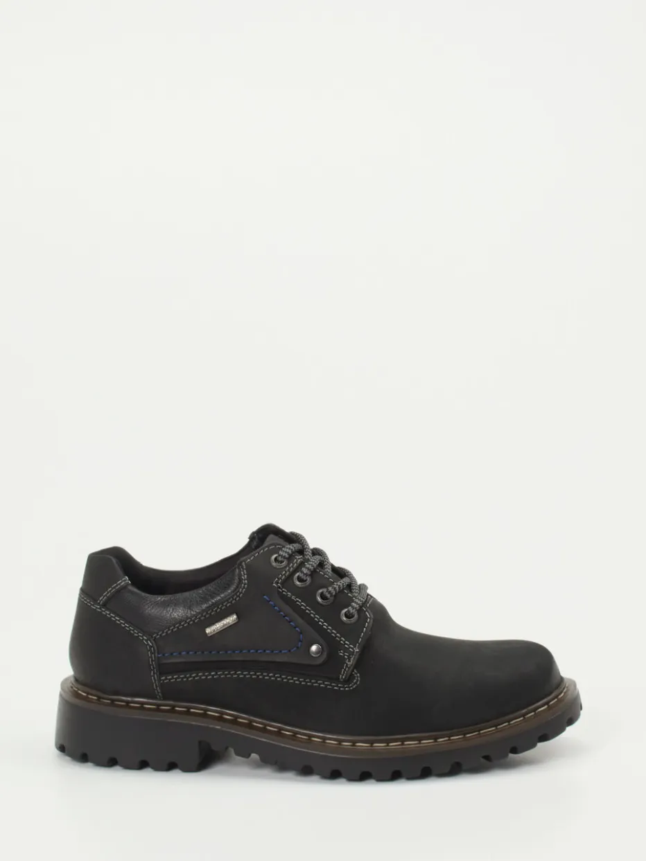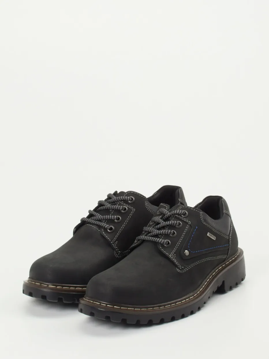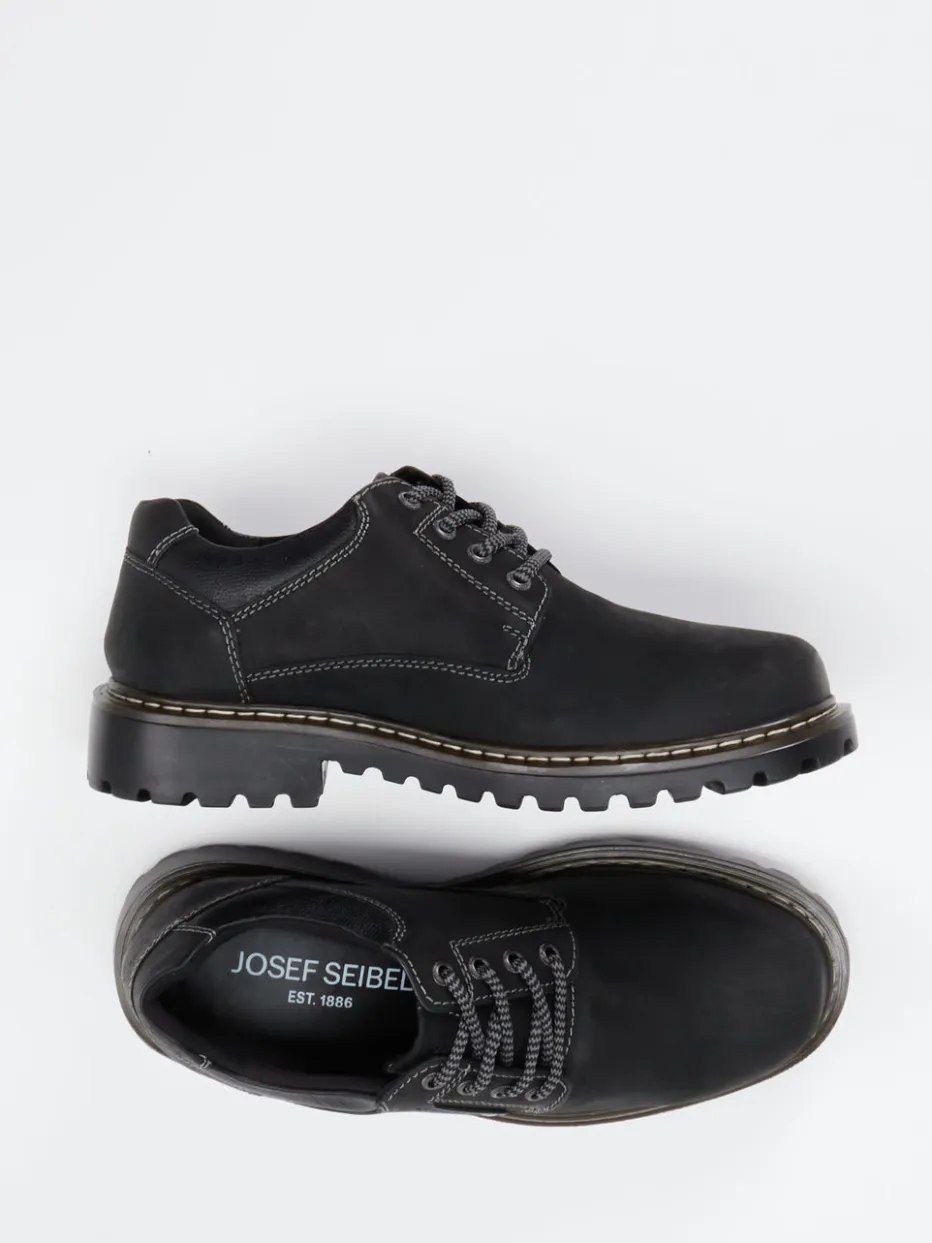 Für Alltag und Gelände gerüstet.Josef Seibel präsentiert hochwertige Derby Boots aus wind- und wasserdichtem Nubukleder. Ob Stadtspaziergang bei Nieselregen oder Wochenendausflug ins Grüne – das ergonomische Innenleben mit gepolstertem Schaftrand, herausnehmbarem Fußbett und schweißabsorbierendem Textilfutter garantiert langanhaltenden Komfort. Die schwarze Oberfläche zeigt sich matt, mit dezent anthrazitfarbenen Kontrastnähten und zweifarbiger Schnürung. Der Look wirkt durch klassische Silhouette, Metallösen und Label-Detail betont maskulin. Die tief profilierte Gummisohle sorgt für maximalen Grip und orientiert sich klar am aktuellen Utility- und Workwear-Trend. Vielseitiges Design für kompromisslose Bewegungsfreiheit im Alltag.
