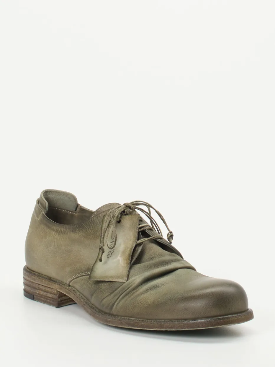 Handwerkskunst mit Patina.Shoto interpretiert den klassischen Herren-Derby in feinstem Büffelleder neu. Für stilbewusste Alltagssituationen oder legere Office-Looks überzeugt dieses Modell mit nuancenreicher Patina in Schlammgrün, einer sichtbaren Faltenstruktur im Vorderblatt und einer zurückhaltend abgerundeten Silhouette. Das matte Finish und der dezente Used-Look strahlen authentischen Vintage-Charme aus. Eine genagelte Ledersohle mit Gummieinsatz und das weiche Kalblederfutter sorgen für Tragekomfort und Haltbarkeit. Inspiriert von „Quiet Luxury“ und dem Distressed-Trend, wirkt der Schuh elegant und gleichzeitig individuell. Ein hochwertiges Statement – gefertigt in Italien mit unverkennbarem Charakter.
