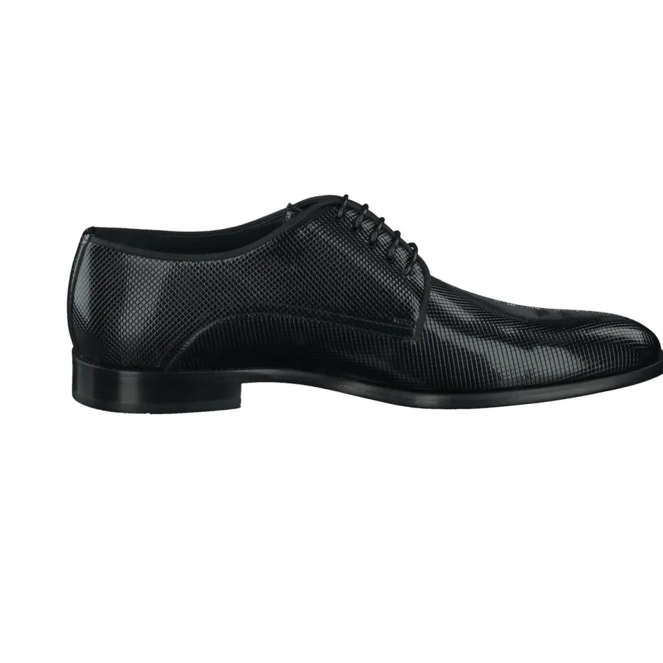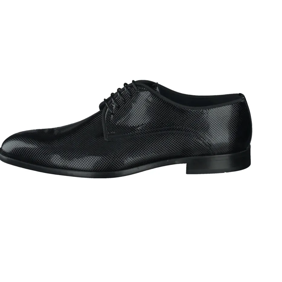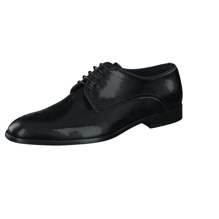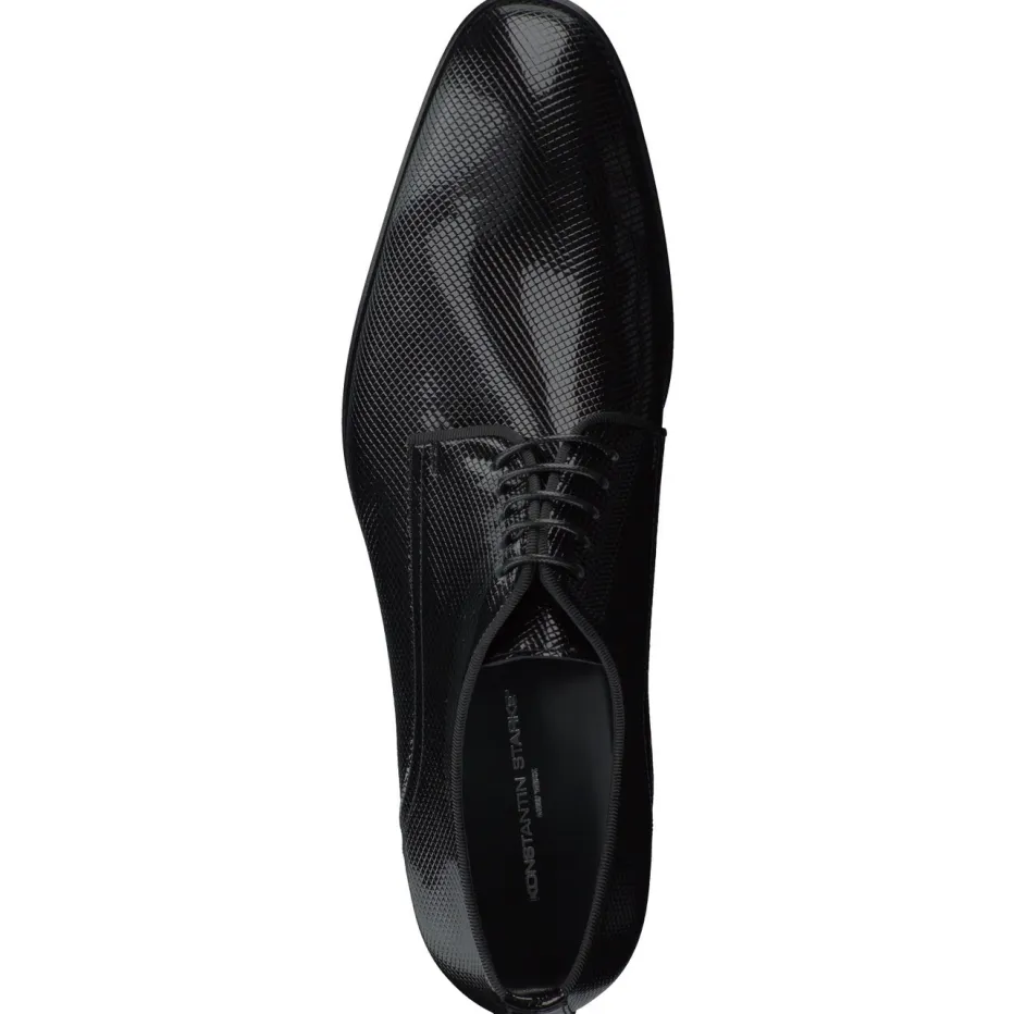 Business-Eleganz neu interpretiert.Konstantin Starke präsentiert einen Herren-Derbyschuh, der klassische Formgebung mit subtiler Raffinesse verbindet. Für formelle Meetings oder festliche Events bietet der aus schwarzem Hochglanzleder gefertigte Schuh dank feiner Laserdruck-Prägung ein dezentes Strukturspiel. Die schmale, zulaufende Silhouette und die Ton-in-Ton-5-Loch-Schnürung unterstreichen den eleganten Charakter. Innen sorgt Kalblederfutter für Komfort, die durchgenähte Ledersohle ist mit einem alltagstauglichen Gummibesatz versehen. Der Look passt ideal zum Business-Anzug oder Abendoutfit und greift aktuelle Trends wie Quiet Luxury auf. Ein formvollendeter Herrenschuh für höchste stilistische Ansprüche.