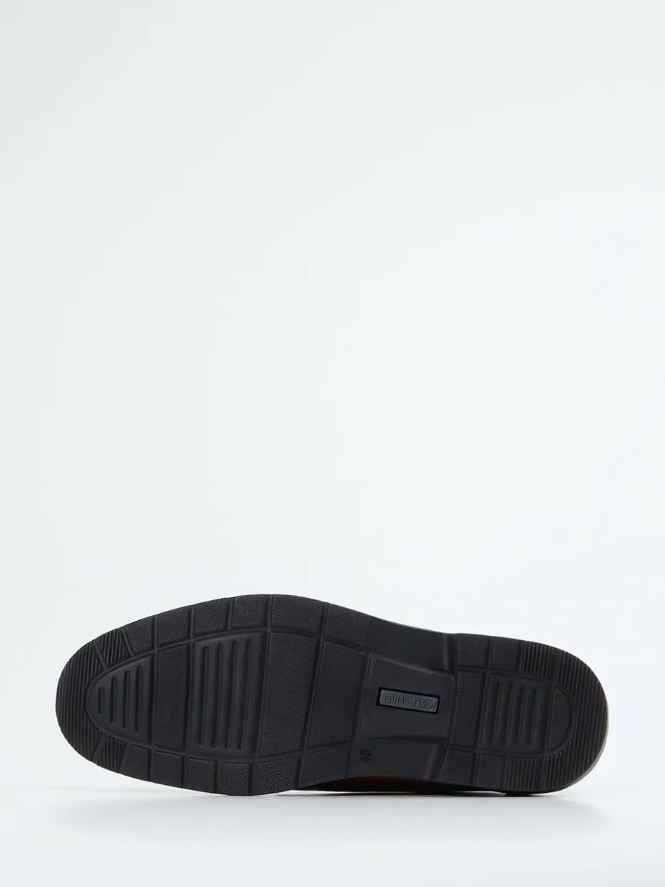 Ob im Office oder auf dem Weg dorthin – das mittelbraune Kalbleder mit leichtem Glanz sorgt für einen souveränen Auftritt. Eine dunkelbraune Fersenkappe sowie dunkelblaue Schnürsenkel setzen dezente Akzente, während das Innenfutter aus Leder und das gepolsterte Wechselfußbett für hohen Komfort stehen. Der klassische Leisten mit runder Spitze und die robuste Gummisohle mit Profil verbinden Eleganz mit Alltagstauglichkeit. Kombiniert mit einer navyfarbenen Business-Hose entsteht ein stimmiger Look.
