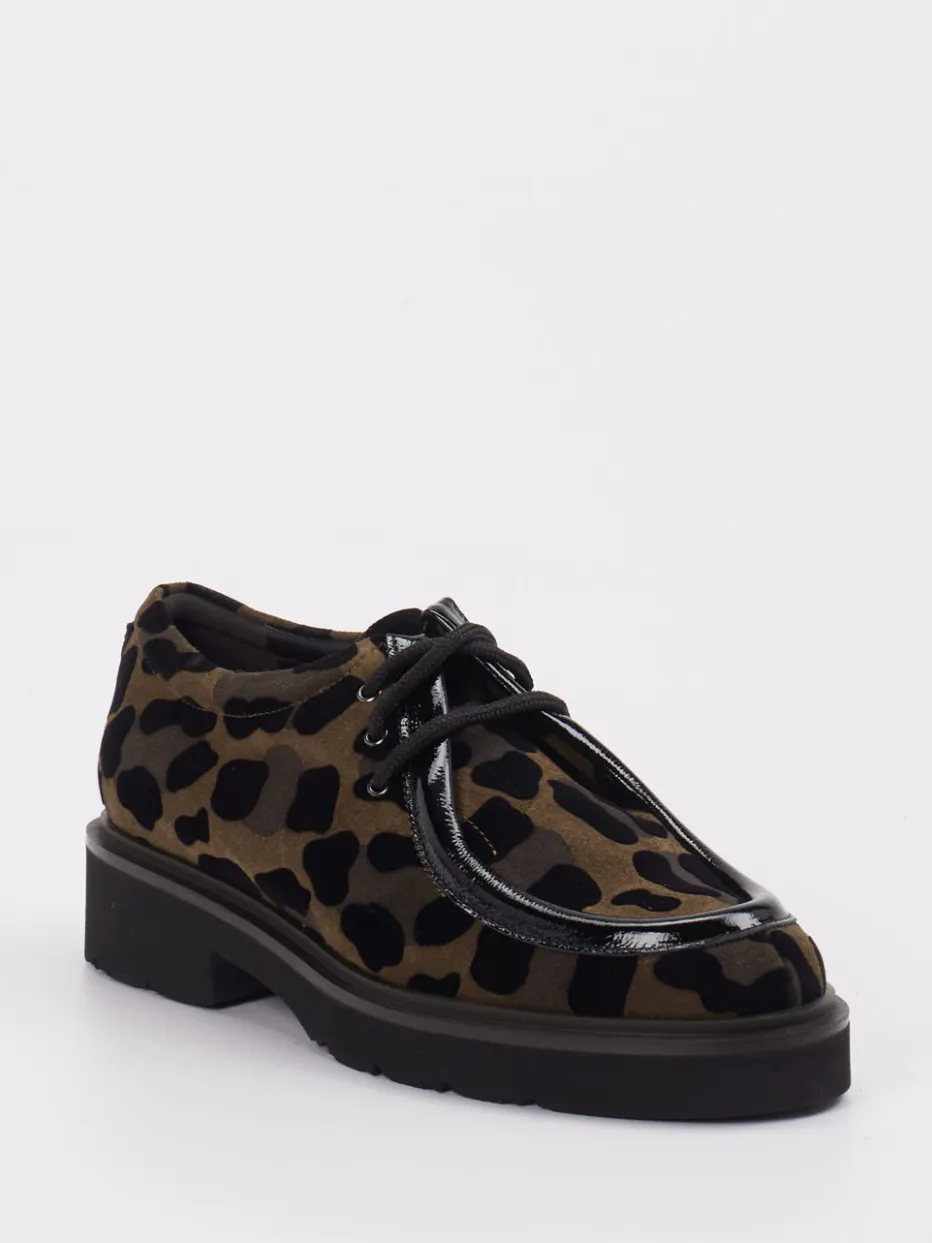 Statement-Look fürs nächste Ausgeh-Date.Mannori präsentiert mit diesen Derby-Schnürschuhen ein Modell, das femininen Stil mit expressivem Design vereint. Ob City-Tag oder Abendanlass – der Schnürschuh überzeugt durch samtiges Veloursleder mit weicher Struktur in olivbraunem Leoprint-Finish. Glänzende Lack-Paspeln, eine klassische Rundsilhouette und eine robuste Gummisohle mit 4 cm Absatz sorgen für optische Spannung und Komfort. Die Ton-in-Ton-Schnürung unterstreicht den monochromen Look. Inspiriert von Streetwear und 90s-Vibes passt dieser Trendschuh perfekt zu Oversize-Blazern und schlichten Basics. Ein selbstbewusstes Styling-Statement mit markentypischer Finesse.