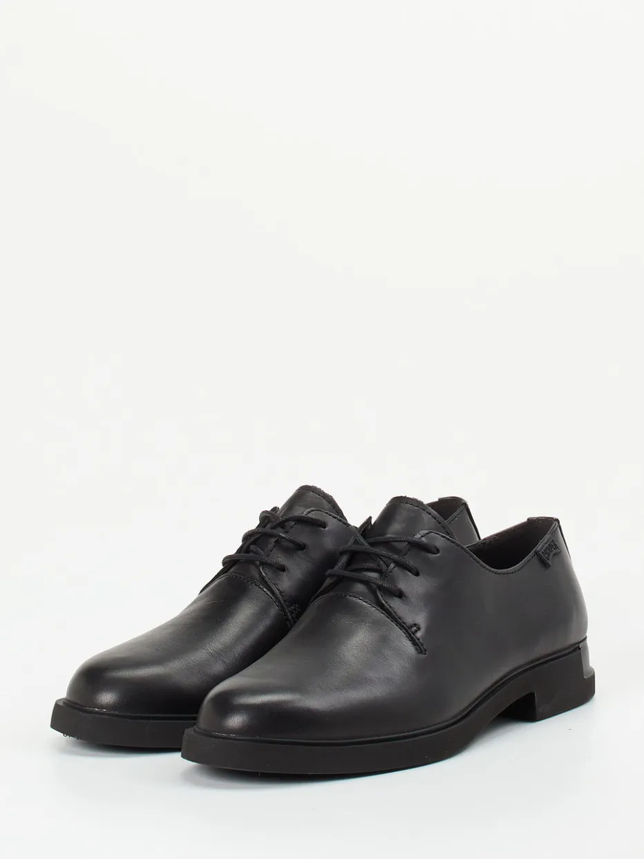 Einen schlichten Schnürschuh mit moderner Silhouette präsentiert die Marke Camper hier. Das schwarze Kalbleder kommt auf dem verrundeten Leisten sportlich zur Geltung. Superleicht und von innen weich gepolstert, vermittelt die schwarze Gummisohle mit dem ausgefallenen Absatz ein komfortables Tragegefühl. Ein toller Schnürschuh für viele Gelegenheiten.