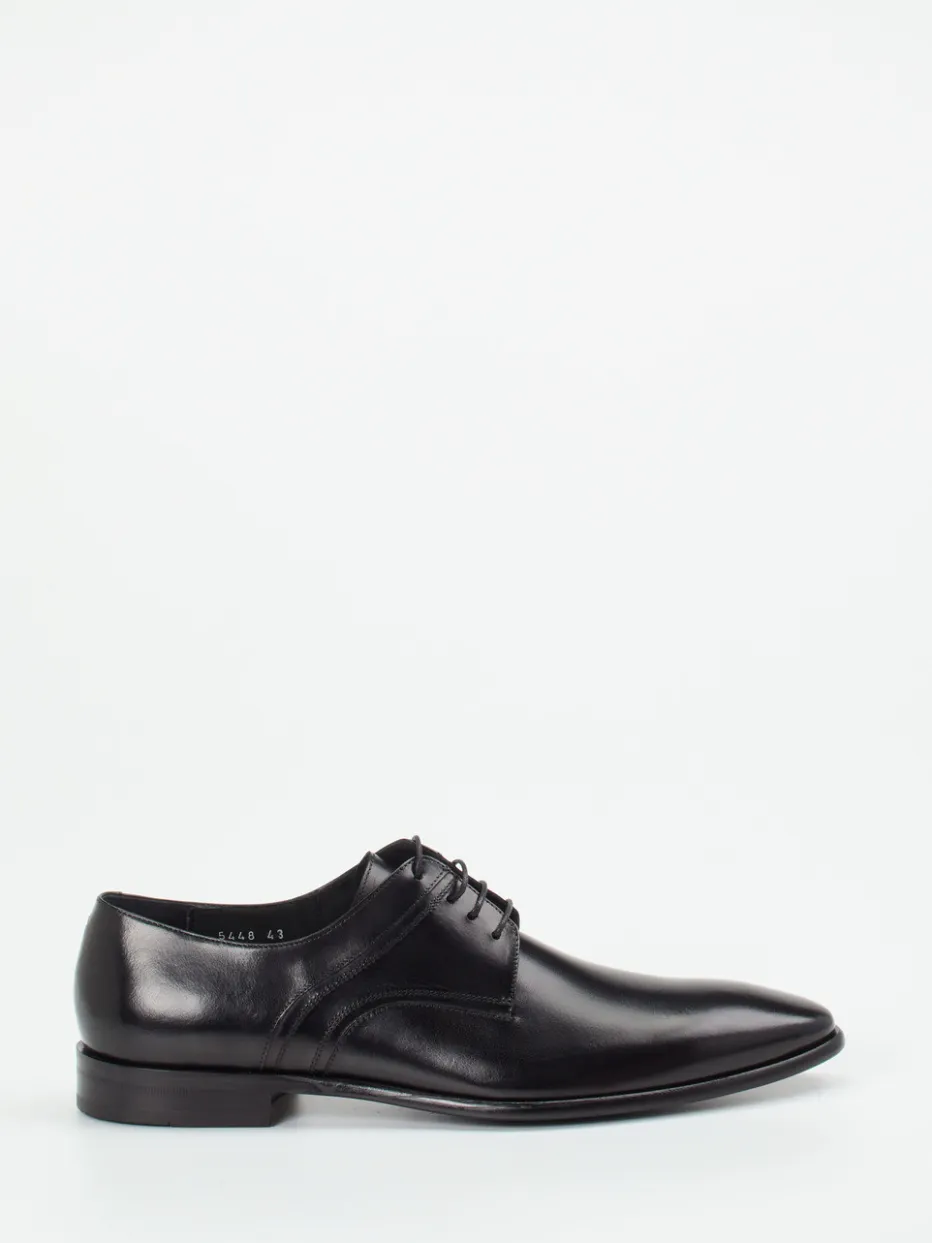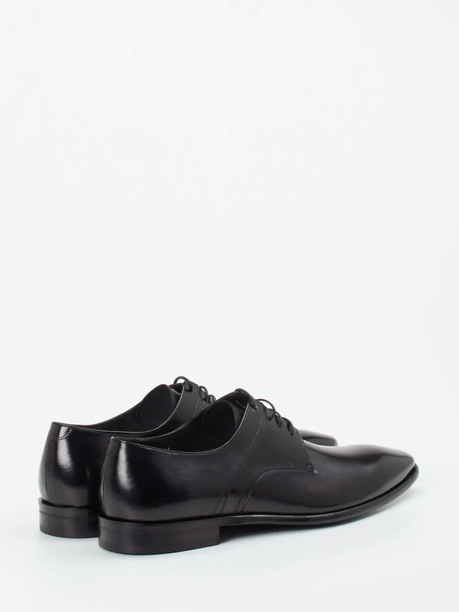 Die glänzende Oberfläche des schwarzen Kalbleders und die klassische Silhouette verleihen diesem Derby-Modell einen souveränen Auftritt im formellen Kontext.