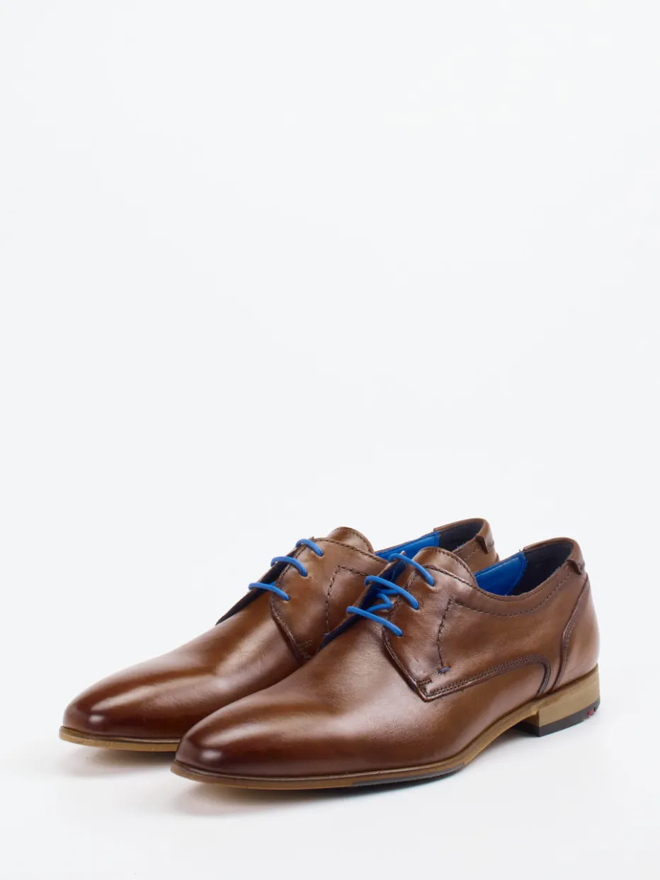Business-Klassiker mit stilvoller Abweichung.Lloyd überzeugt in der Kategorie Herrenschuh mit einem modern interpretierten Derbyschuh. Ob im Büro oder bei festlichen Terminen – dieser Schuh ist ideal für elegante Anlässe mit modischem Anspruch. Das cognacbraune Kalbleder zeigt sich glänzend veredelt und fein marmoriert. Blaue Kontrastschnürsenkel und ein farblich abgestimmtes Futter verleihen dem schmalen, spitz zulaufenden Leisten eine moderne Note. Die hochwertige Ledersohle mit Gummieinsatz bietet sicheren Tritt und Komfort. Ein stilvoller Akzent in jedem Business-Outfit. Lloyd steht für souveräne Ästhetik und handwerkliche Qualität in zeitgemäßem Design.