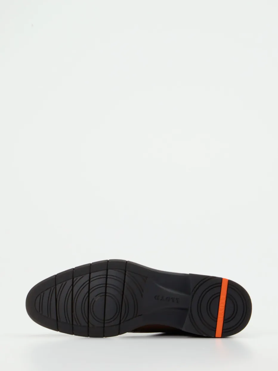 Smart und souverän im Alltag.Die Marke Lloyd verleiht den Herren-Desert Boots eine Eleganz, die sich im Büro wie in der Freizeit bewährt. Fein glänzendes Kalbleder in Mittelbraun und eine markant-kontrastierende 3-Loch-Schnürung mit dunkelgrauen Schnürsenkeln setzen klassische Akzente. Der knöchelhohe Schnitt wirkt dank schmal zulaufender Silhouette modern und stilbewusst. Die leichte Gummisohle mit rutschhemmender Struktur sorgt gemeinsam mit dem soften Memory Foam Fußbett für ausgezeichneten Tragekomfort. Dezente Ziernähte und ein gepolsterter Schaftrand runden das minimalistische Design ab. Ein idealer Begleiter für Smart Comfort Looks der Herbst/Winter Saison. Komfort trifft auf Ästhetik in echter Lloyd-Qualität.
