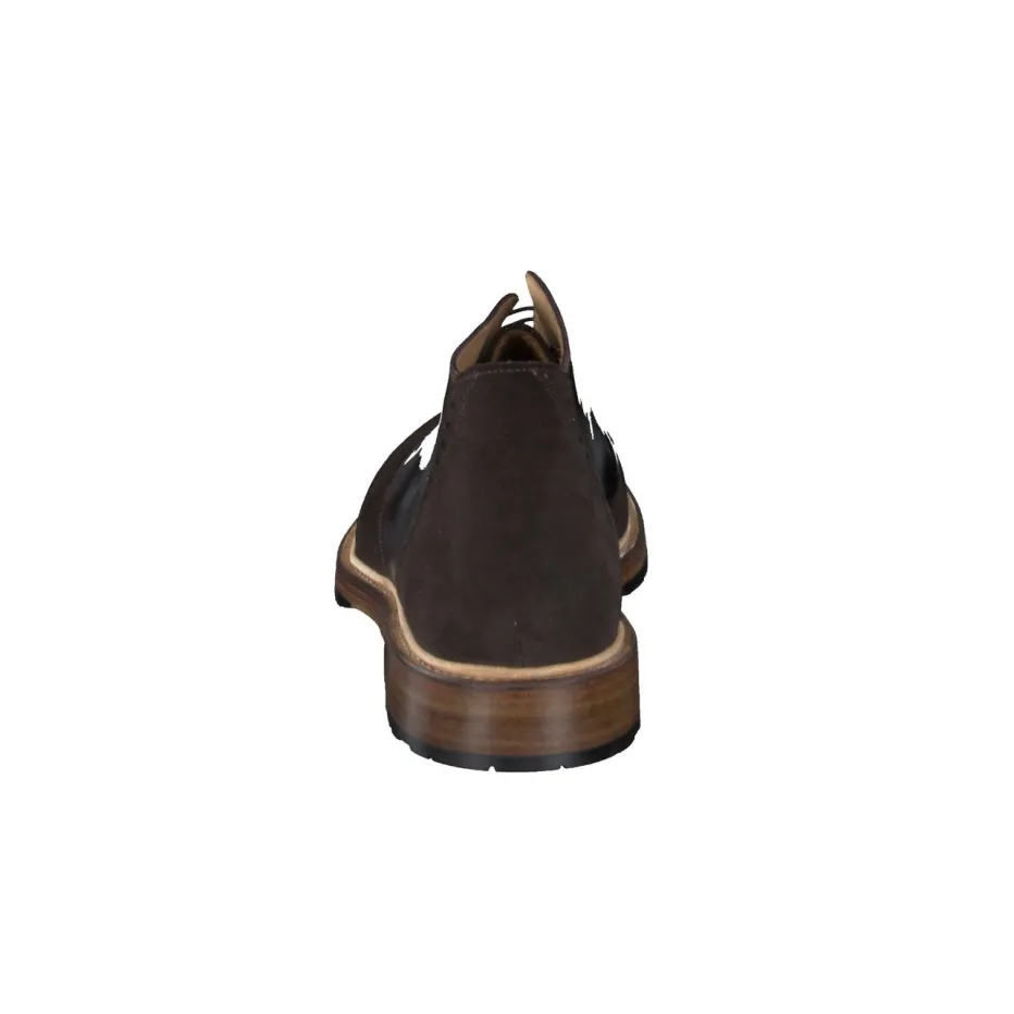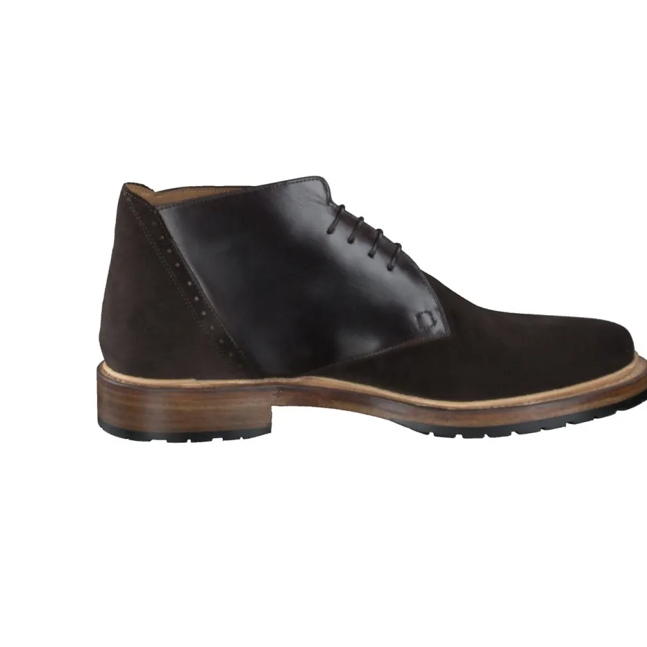 Minimalismus trifft Materialvielfalt.Die Herrenschuhe von Franz Gustav gehören in die Kategorie Desert Boots. Ideal für den Einsatz im Büro oder beim urbanen Stadtbummel vereinen sie klassische Formgebung mit funktionalem Design. Der hochwertige Materialmix aus Veloursleder und glattem Kalbleder verleiht dem dunkelbraunen Modell haptische Tiefe und visuelle Eleganz. Die klassische, knöchelhohe Silhouette wird durch feine Ziernähte an der Ferse und eine Kontrastsohle in Holzoptik ergänzt. Eine rutschfeste Leder-Gummisohle mit Profil bietet Stabilität für den Alltag. Dezente Heritage-Elemente und eine klare Linienführung machen diesen Schnürschuh stilistisch wandlungsfähig. Zeitlose Funktionalität mit elegantem Understatement aus dem Hause Franz Gustav.
