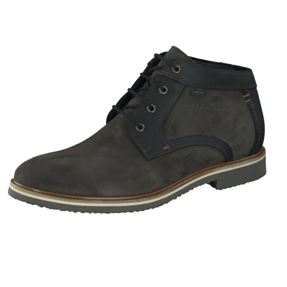 Wetterfest durch Büro und Wochenende.LLOYD präsentiert klassische Herren-Desert Boots für Herbst und Winter. Perfekt für nasskalte Tage: Das wind- und wasserdichte Veloursleder in Anthrazit mit samtiger Textur trifft auf dunkelblaue Nappaleder-Einsätze und eine rutschfeste Gummisohle mit kontrastierendem Weißrand. Die knöchelhohe, schmal zulaufende Form mit robusten Metallösen und gepolsterter Ferse kombiniert urban-minimalistische Linien mit bequemen Trageeigenschaften. Die GoreTex-Beschichtung sorgt für Schutz bei Wind und Wetter. Zwischen Casual und Business tragbar – gut zu Jeans oder Chino. Markentypische Qualität gepaart mit funktionalem Stil für jeden Tag.