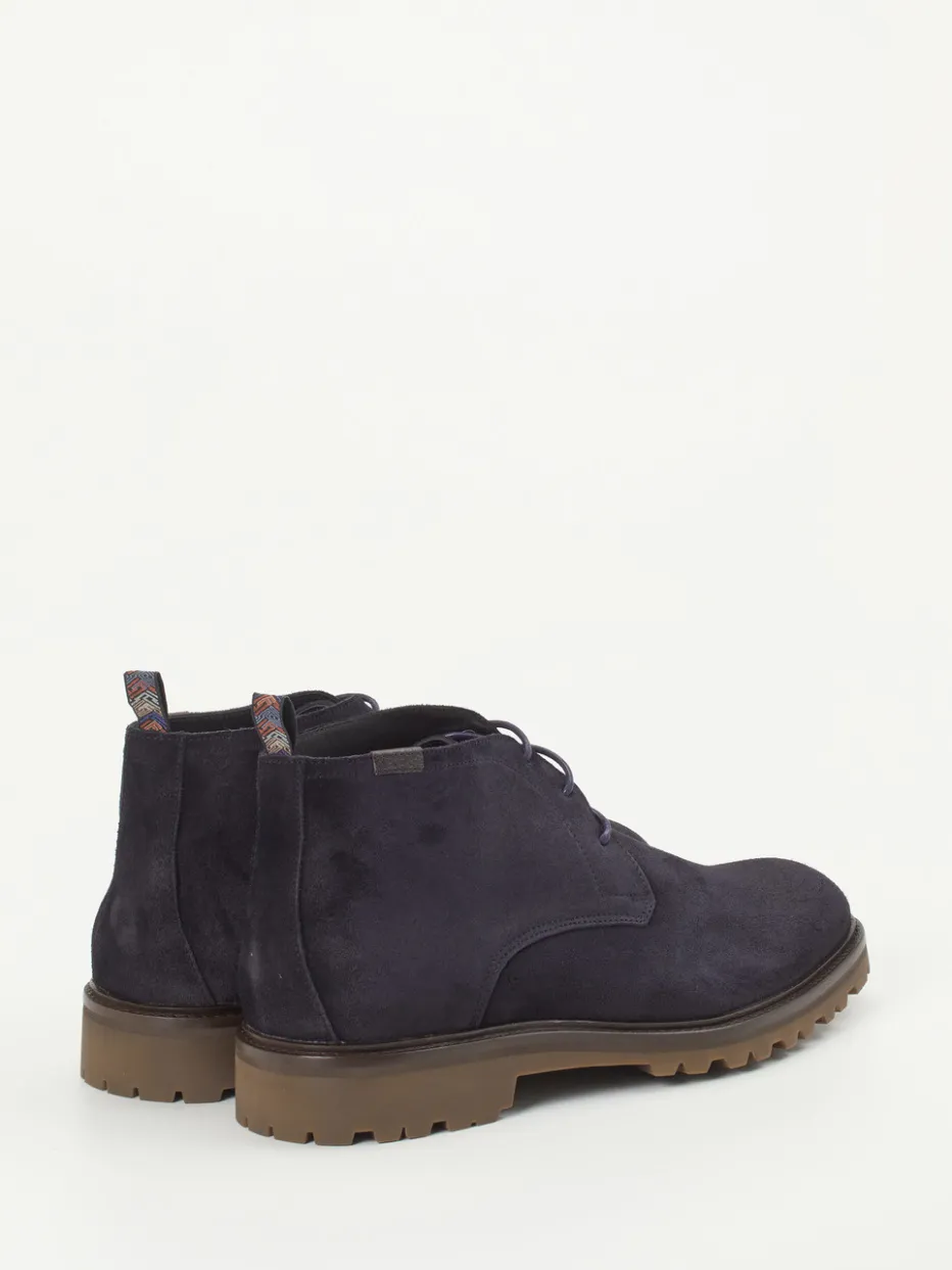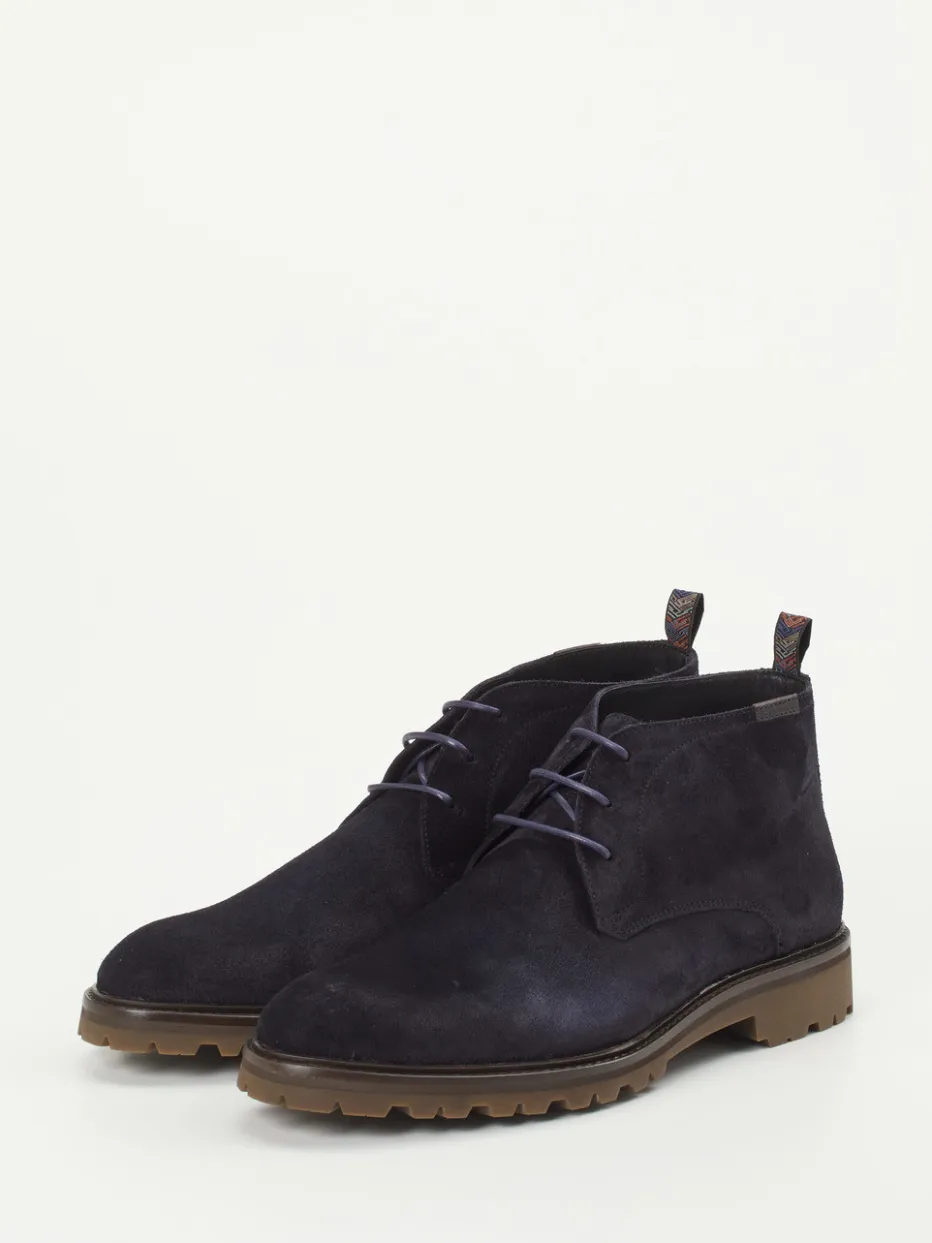 Stilvoll durch windige Tage.Floris van Bommel präsentiert zeitlose Desert Boots für Herren. Gefertigt aus feinstem, samtig angeschliffenem Veloursleder in Navyblau, verbinden diese knöchelhohen Schnürboots klassische Eleganz mit funktionaler Alltagstauglichkeit. Die markante Profilsohle aus Gummi sorgt für zuverlässigen Halt auf nassen Untergründen. Eine auffällige Zuglasche mit Muster setzt einen dezenten Akzent im ansonsten minimalistischen Gesamtbild. Der gepolsterte, herausnehmbare Innenschuh aus Leder verspricht hohen Tragekomfort – auch im Business-Kontext. Durch ihren klaren Look lassen sich die Boots vielseitig kombinieren, etwa mit Chinos und Strick. Ein souveräner Begleiter mit Stilanspruch und subtiles Understatement.