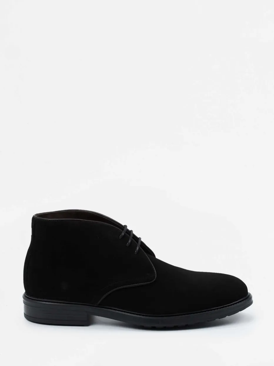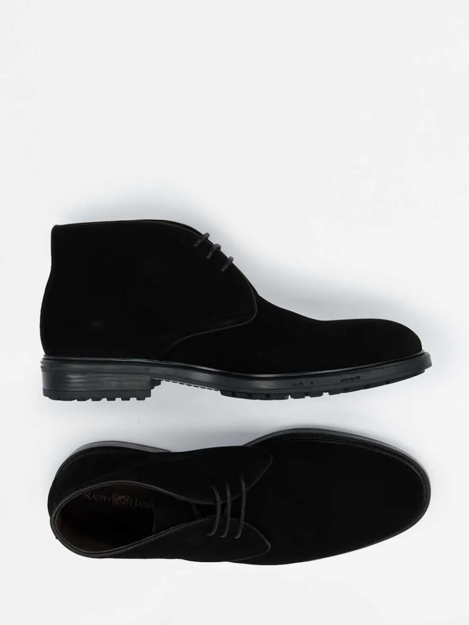 Stilbewusst durch Büro und Alltag.Ralph Harrison präsentiert mit diesen Desert Boots ein Herrenmodell, das zeitlose Eleganz ausstrahlt. Für urban orientierte Männer, die einen markanten Look mit dezentem Statement suchen, ist dieses Modell ideal. Gefertigt aus hochwertigem Veloursleder, samtig angeschliffen und in mattem Schwarz, überzeugt der knöchelhohe Schuh mit klarer Silhouette. Ton-in-Ton-Nähte, ein minimalistisches Design sowie eine profilierte Gummisohle mit sicherem Grip unterstreichen die funktionale Raffinesse. Die 3-Loch-Schnürung sorgt für strukturierten Halt, während der dezente Materialkontrast durch das Kalblederfutter Zusatzkomfort ermöglicht. Passend zu „Quiet Luxury“ und Business Casual – etwa kombiniert mit Chinohose und Strickpullover. Vielseitigkeit und Qualität im maskulinen Stil von Ralph Harrison.