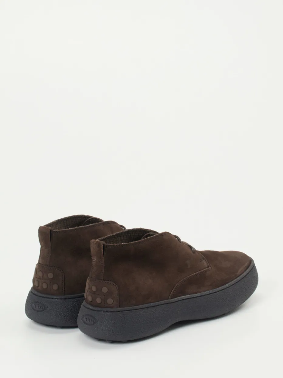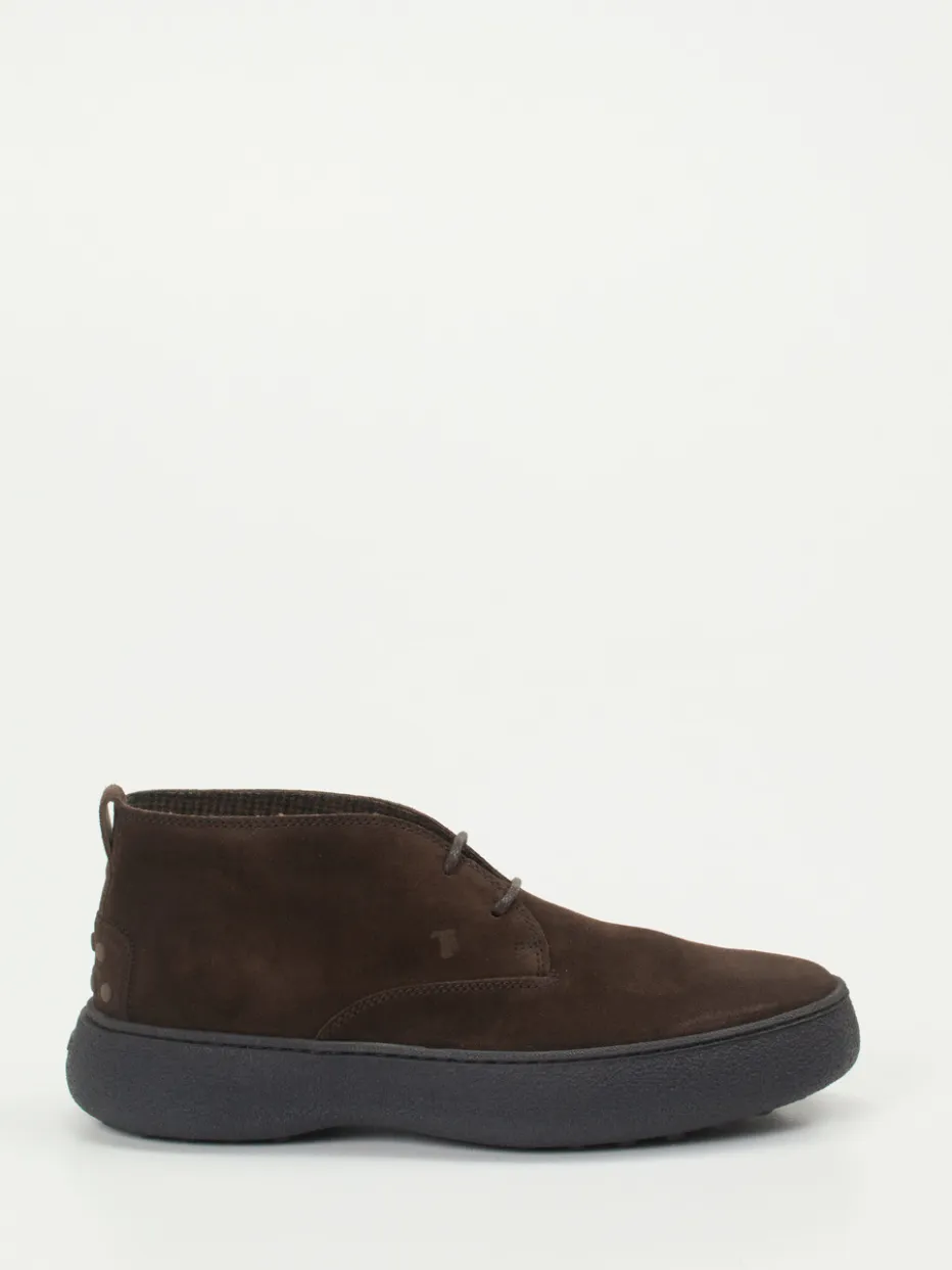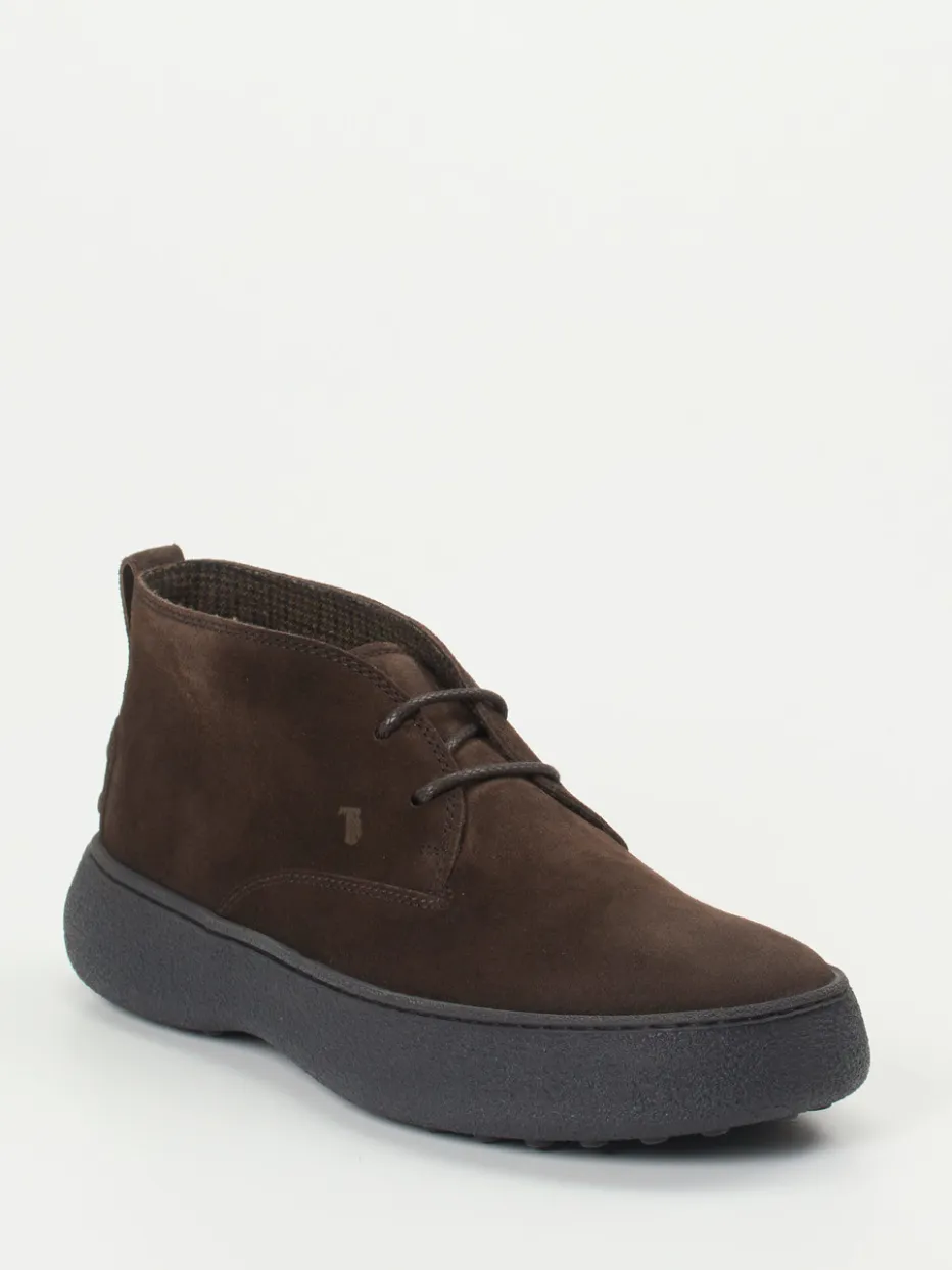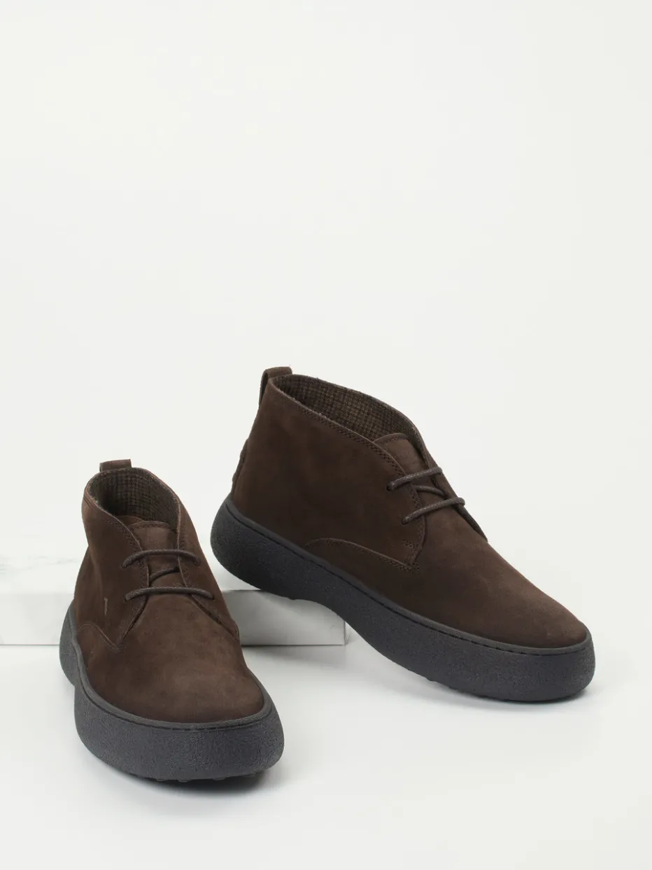 Der Herren-Desert-Boot von Tod’s vereint edle Materialien mit urbaner Lässigkeit. Gefertigt aus kaffeebraunem Veloursleder mit matter Oberfläche und Ton-in-Ton-Nähten, besticht das Modell durch eine reduzierte Silhouette und dezent geprägtes Seitenlogo.