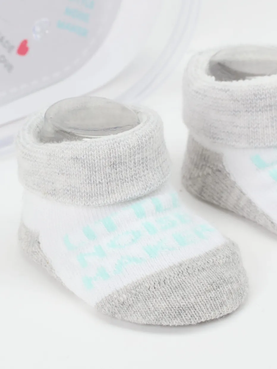 Weicher Start für kleine Füße. Camano präsentiert mit diesen Babysocken eine unisex Erstlingsvariante für entspannte Wohlfühlmomente. Das Modell eignet sich hervorragend für zu Hause oder unterwegs und überzeugt durch seine angenehm weiche Textilstruktur mit gestrickter Oberfläche. Hellgrau bildet die Grundfarbe, weiße und mintfarbene Partien sowie ein kontrastfarbener Schriftzug setzen liebevolle visuelle Akzente. Der Umschlagbund sorgt für guten Halt – ganz ohne Verschluss. Minimalistisches Design und sanfte Farben betonen den modernen, genderneutralen Look. Als Geschenk verpackt in einer herzförmigen Box – perfekt für Neugeborene.
