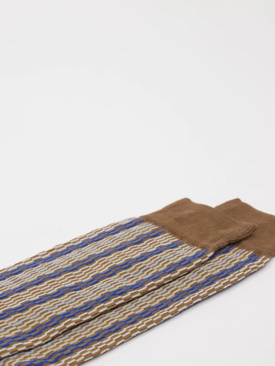Feinstrick, der Stil und Komfort vereint. Alto Milano präsentiert klassische Feinstricksocken für Herren. Ideal für stilvolle Alltagsmomente – ob im Büro oder beim Stadtbummel – bestechen diese Textilsocken durch ihren hochwertigen Feinstrick mit glatter Oberfläche. Das mehrfarbige Design kombiniert Mittelbraun, Beige und Kornblumenblau in einem grafischen Wellenmuster, das Retro-Vibes versprüht. Der elastische Bund sorgt für optimalen Sitz, während die verstärkte Zehen- und Fersenpartie Langlebigkeit garantiert. Eine Ton-in-Ton Stickerei auf der Sohle verleiht ihnen ein dezentes Branding. Perfekt für minimalistische und klassische Looks. Ein Accessoire mit Understatement – italienischer Stil bis in die Spitze.