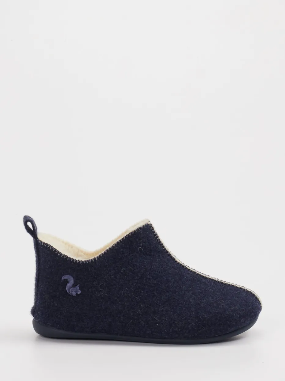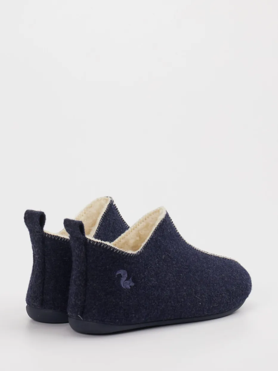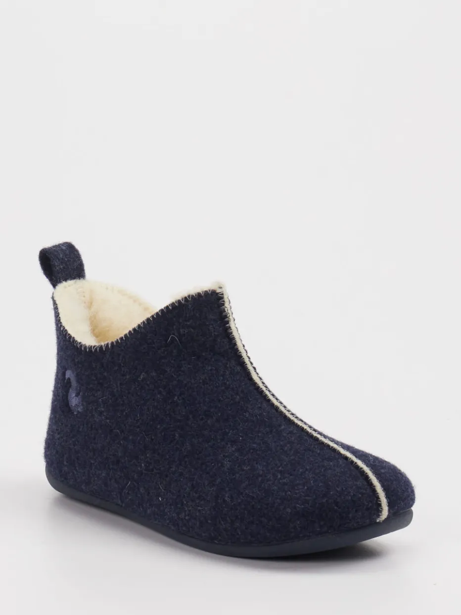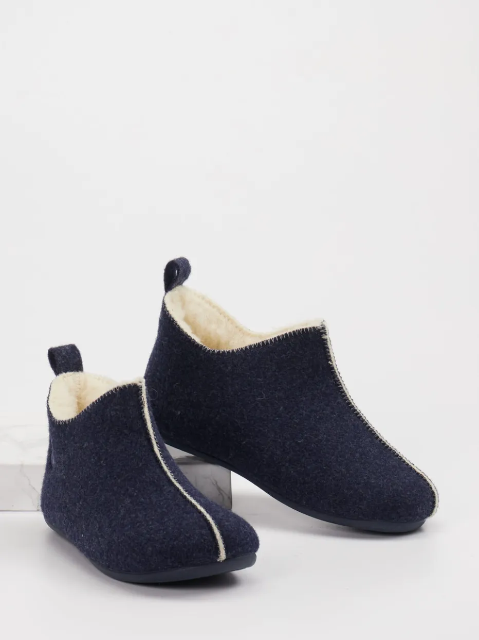 Minimalistisch warm durch den Winter. Thies präsentiert mit diesen Filzhausschuhen einen formreduzierten Begleiter für entspannte Stunden zuhause. Das dunkelblaue Modell mit naturweißem Wollfutter überzeugt durch eine melierte Oberfläche und kontrastierende Zickzacknähte an Mittel- und Schaftrand. Die knöchelhohe, rund zulaufende Silhouette ergänzt die cleane Formsprache, während eine griffig profilierte Gummisohle für Trittsicherheit auf glatten Böden sorgt. Eine rückseitige Zuglasche erleichtert den Einstieg zusätzlich. Inspiriert vom skandinavischen Stil erfüllt der Schuh aktuelle Trends wie Natural Comfort und die Slow Living Aesthetic. Ein stilvoller Wärmespender mit Fokus auf Funktion und Ruhe im Design.