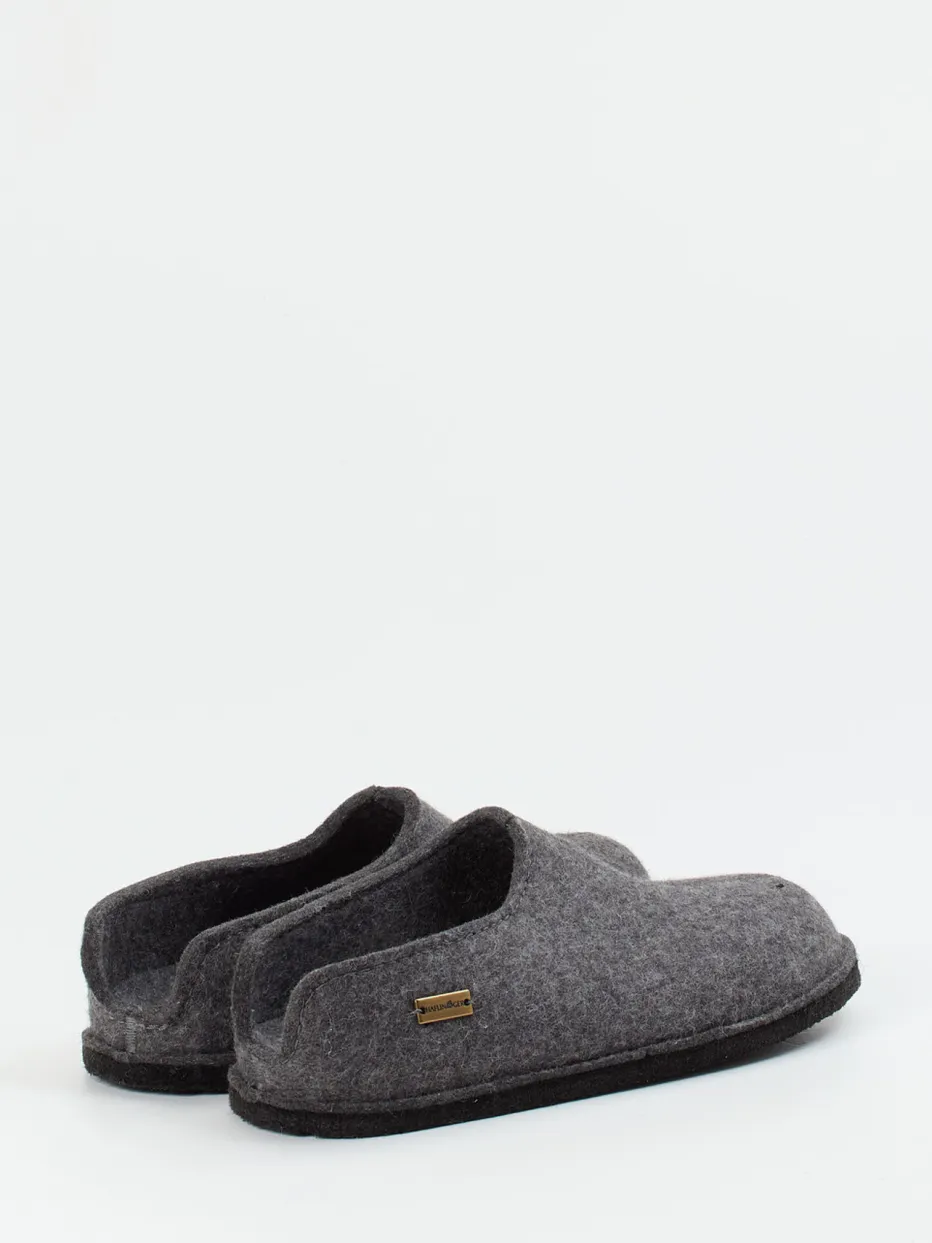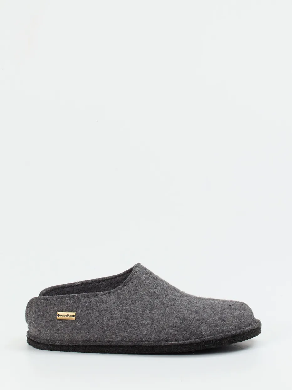 Haflinger präsentiert mit diesem Filzpantoffel einen hochwertigen Hausschuh aus reiner Wolle. Die anthrazitgraue Ausführung aus gewalktem Schurwollfilz schützt zuverlässig vor Bodenkälte und passt mit seinem puristischen Look in jedes Wohnambiente.