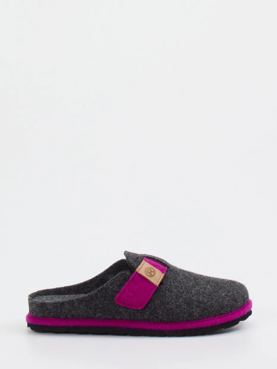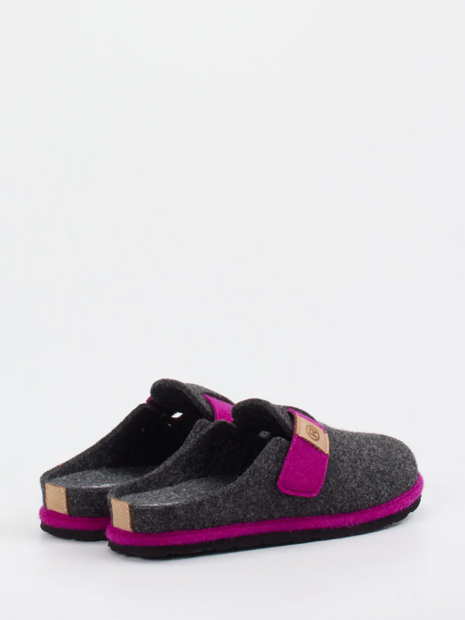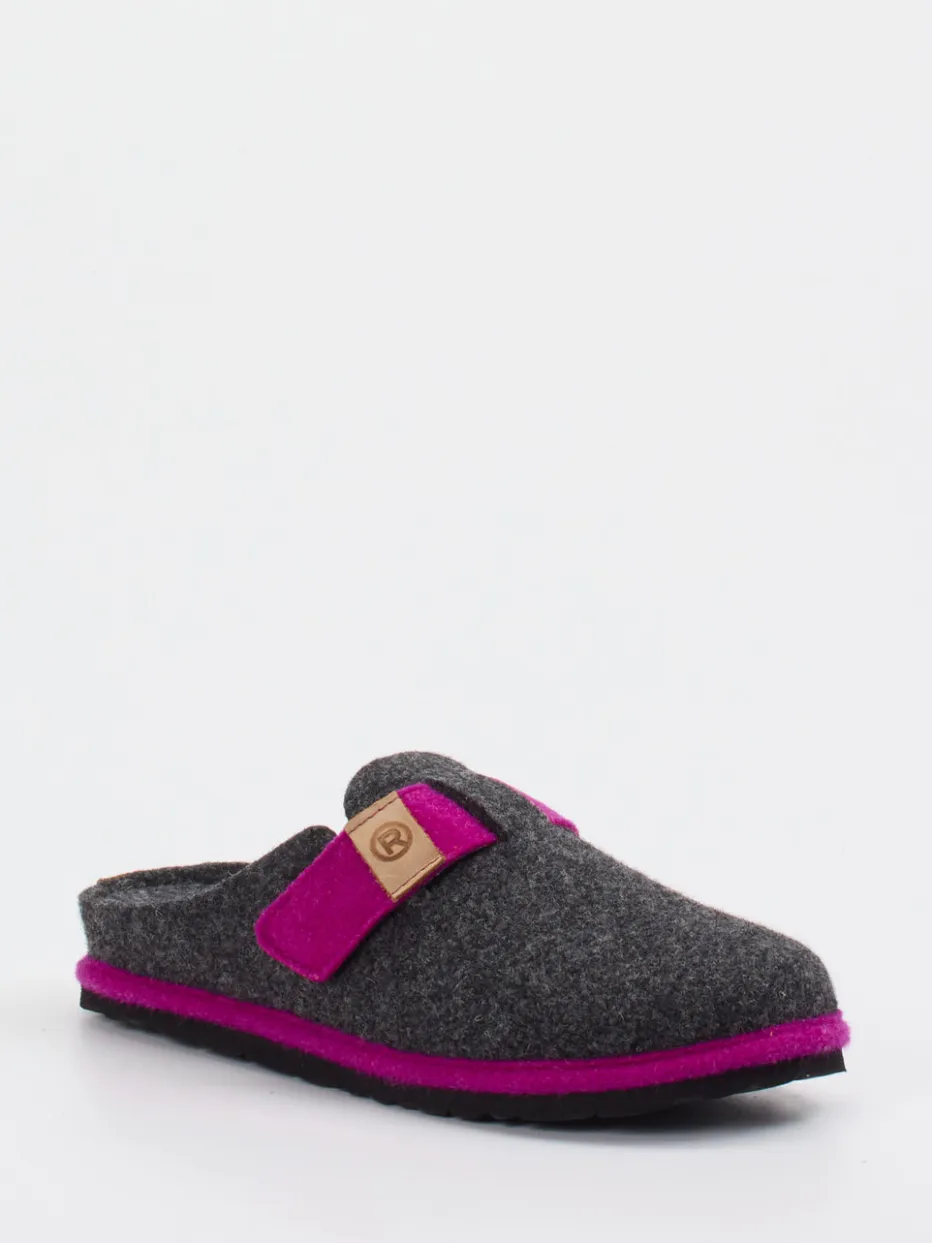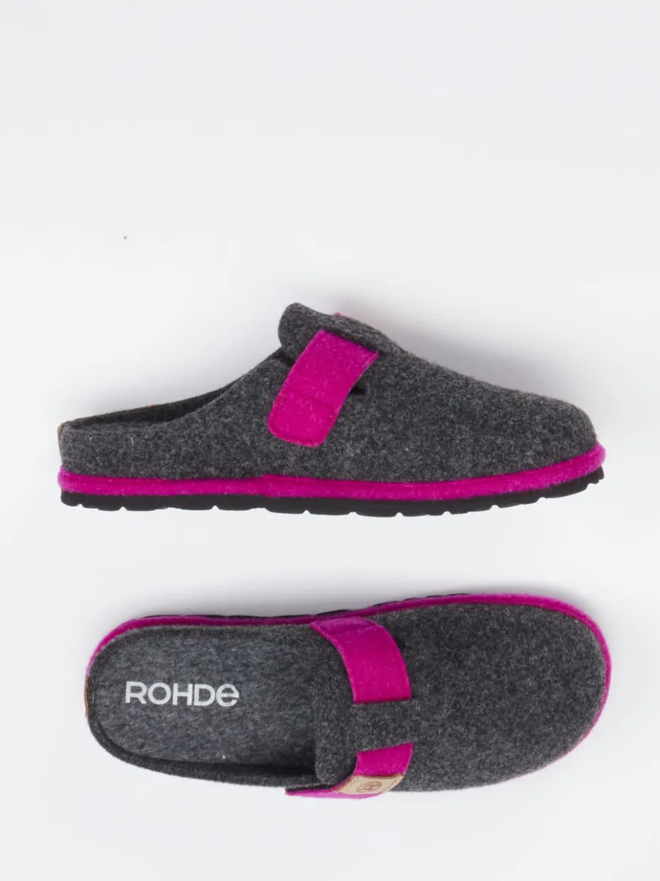 Wärmender Komfort für entspannte Momente.Rohde präsentiert klassische Hausschuhe in Form von Filzpantoffeln. Ideal für ruhige Abende daheim, überzeugen sie durch ihren Materialmix aus robustem Filz mit filziger Haptik und einer profilierten Gummisohle. Das Modell zeigt sich in zurückhaltendem Anthrazitgrau, akzentuiert durch einen farbigen Filzbesatz in Fuchsia und ein kleines Leder-Logo-Patch. Die offene Fersenpartie und das puristische Design greifen den Minimalismus-Trend auf – passend zum aktuellen „Comfort Core“. Harmoniert perfekt mit Loungewear und kuscheligen Wollsocken. Rohde setzt bei diesen Pantoffeln auf entspannte Funktionalität und klaren Stil.