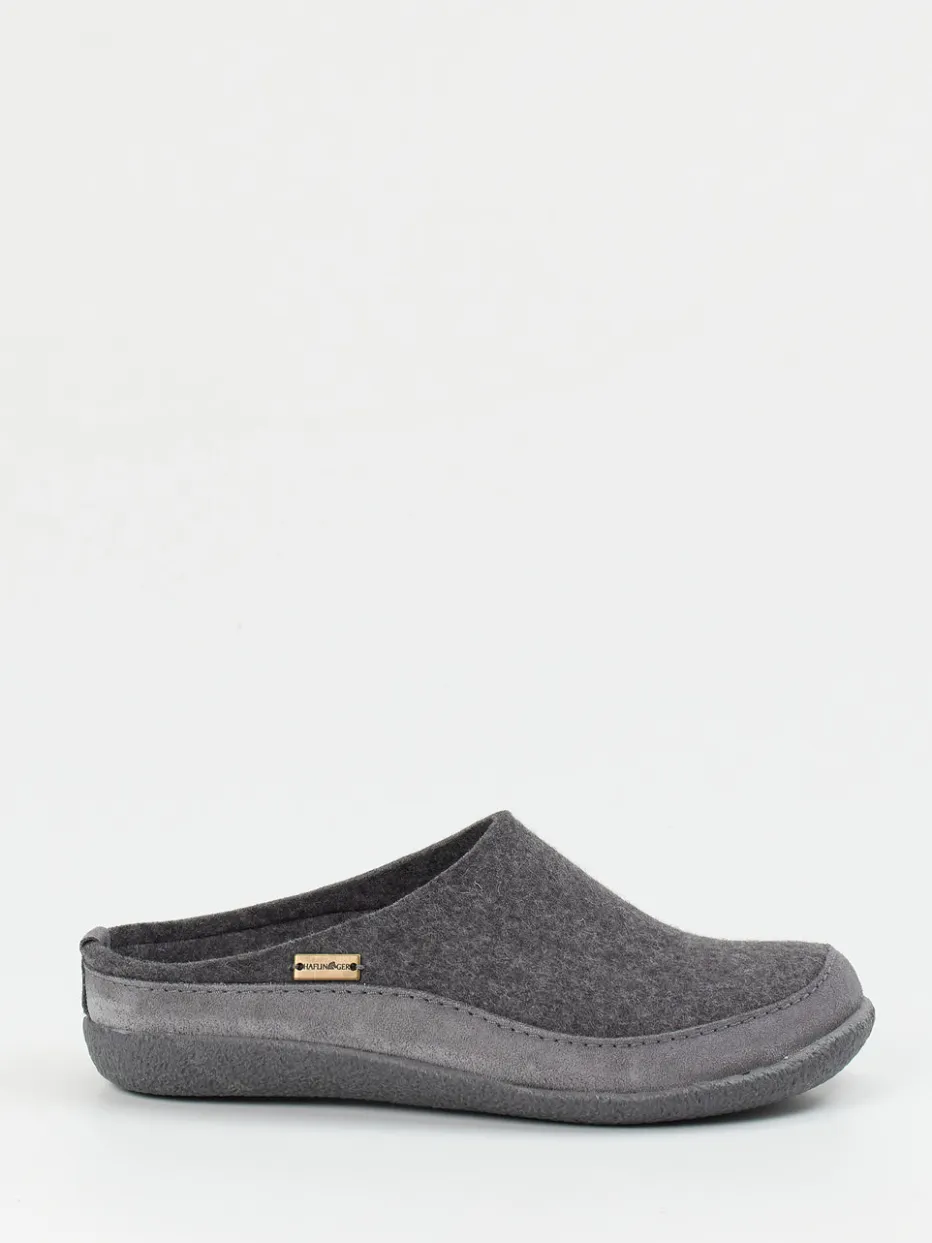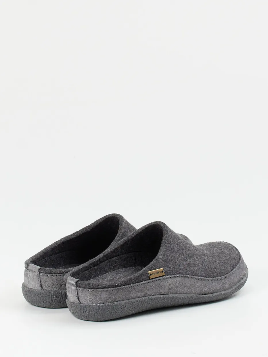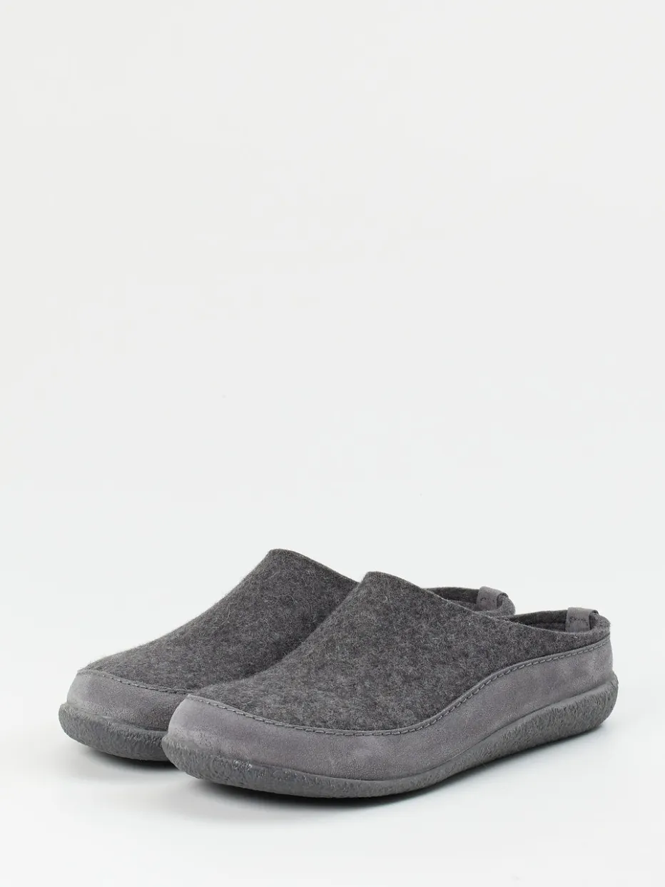 Wärme trifft Struktur.Die Marke Haflinger steht für Qualität im Bereich Hausschuhe – diese Filzpantoffeln machen das eindrucksvoll deutlich. An kühleren Tagen schenken die aus gewalkter reiner Schurwolle gefertigten Pantoffeln wohltuende Wärme. Das weich-filzige Material in Anthrazitgrau trifft auf eine rutschhemmende Gummisohle mit ergonomischer Formgebung. Der offene Fersenbereich in Clog-Optik und die dezente Veloursleder-Kappe bieten Komfort und haltgebenden Sitz. Seitliches Metall-Label, strukturierte Laufsohle und die minimalistische Silhouette unterstreichen den entspannten Look. Perfekt abgestimmt auf Loungewear und entspannte Homewear. Hochwertige Verarbeitung und angenehmes Trageklima – typisch Haflinger.