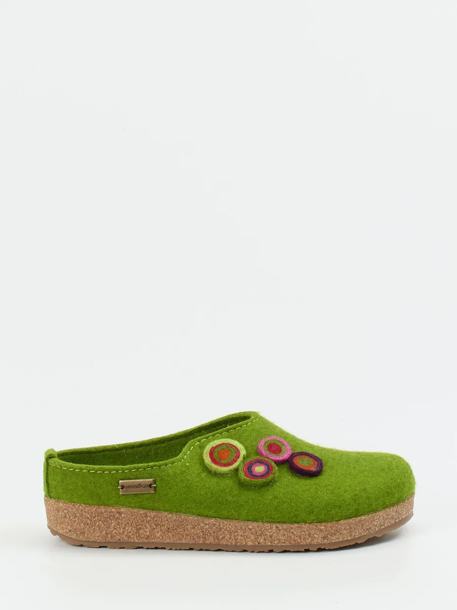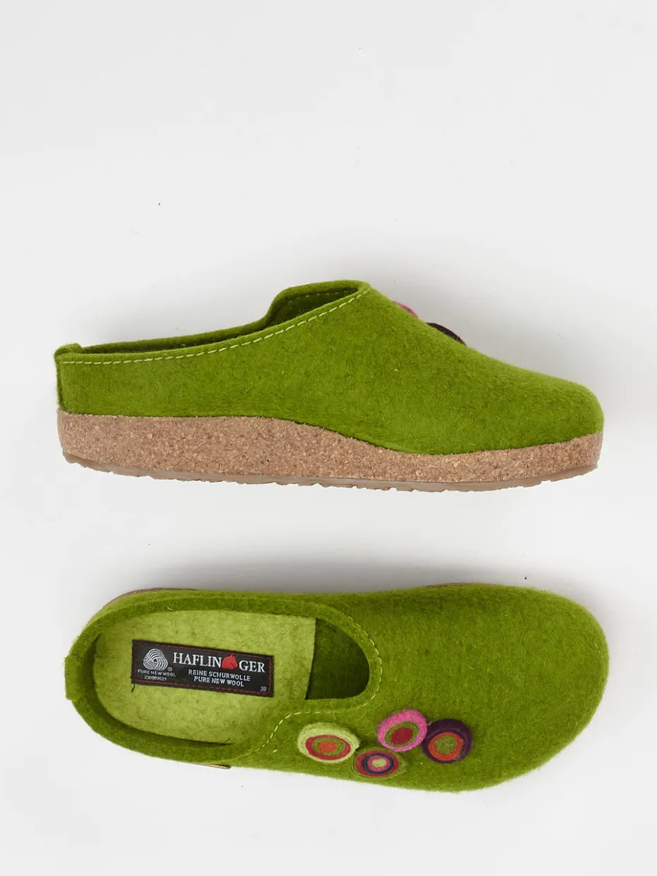 Wohliger Komfort trifft natürliche Leichtigkeit.Haflinger steht für Qualität und Wohlgefühl – dieser Damenhausschuh verbindet beides. Wenn der Tag entspannte Momente zu Hause schenkt, bieten diese Filzpantoffeln in frischem Apfelgrün mit filziger Schurwoll-Oberfläche angenehme Wärme und ein weiches Tragegefühl. Das ergonomische Kork-Latex-Fußbett unterstützt bequem, während die rutschfeste Gummisohle sicheren Halt gewährt. Bunte Applikationen setzen fröhliche Akzente, ein seitliches Metall-Label rundet das Design ab. Inspiriert von alpiner Gemütlichkeit fügt sich dieses Modell stilvoll in natürliche Homewear-Looks. Nachhaltiger Hausschuhkomfort – typisch Haflinger.
