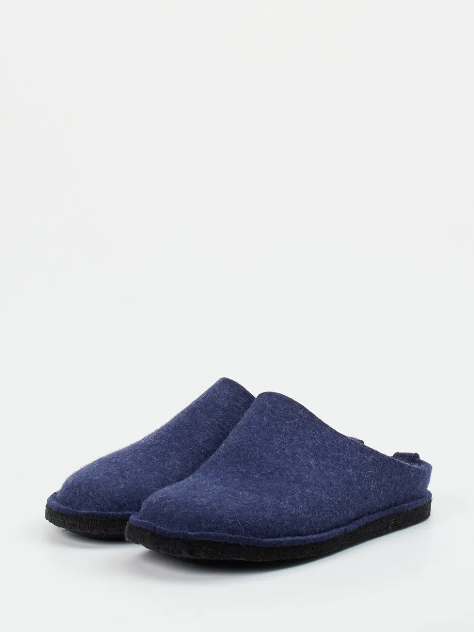 Schlichte Wärme trifft skandinavische Leichtigkeit.Haflinger präsentiert klassische Unisex-Filzpantoffeln mit durchdachtem Komfort. Ob zum Feierabend oder beim gemütlichen Frühstück – das ergonomische Fußbett und die temperaturausgleichenden Eigenschaften sorgen für Wohlbefinden bei jedem Schritt. Das filzartig gearbeitete Obermaterial aus 100 % Schurwolle in Dunkelblau unterstreicht den minimalistischen Look. Die offene Ferse erleichtert das An- und Ausziehen, während kleine Details wie das seitliche Metalllabel dezent Markencharakter zeigen. Inspiriert vom skandinavischen Slow-Living-Trend, bringt dieses Modell entspannte Ästhetik in den Alltag. Ideale Kombipartner sind wärmende Wollsocken oder ein flauschiger Hausanzug. Angenehm leise, wärmend und natürlich – ein Wohlfühlklassiker von Haflinger.