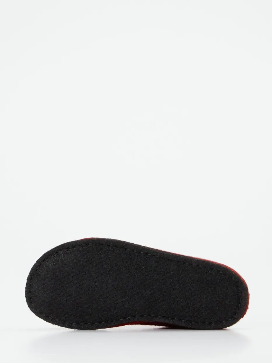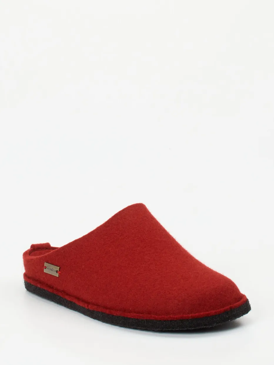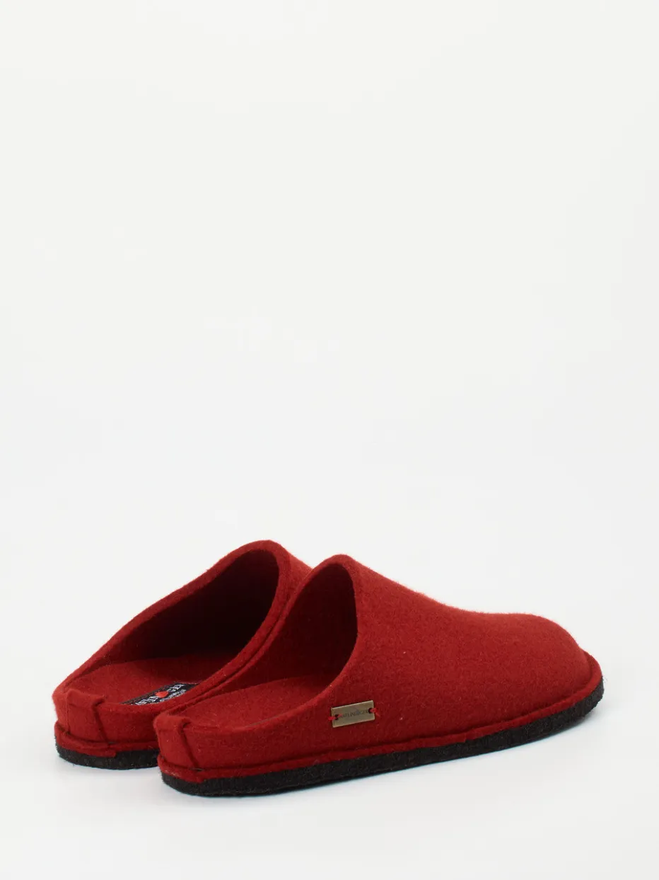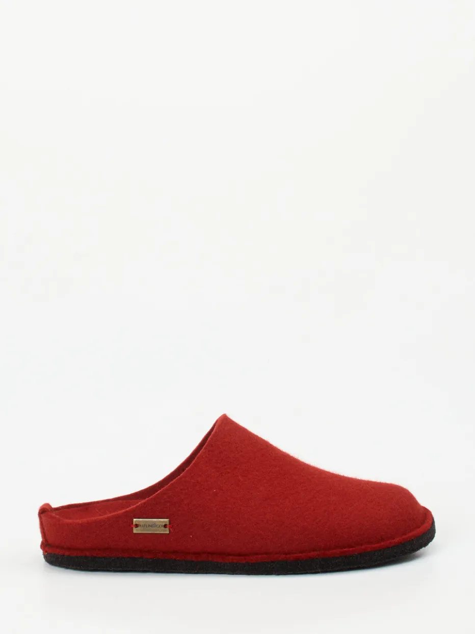 Natürlich wohnen, stilvoll entspannen.Der Hausschuh von Haflinger vereint reduziertes Design mit hohem Tragekomfort. Ideal für gemütliche Tage daheim: Die Filzpantoffeln aus 100 % Schurwolle zeigen sich in tiefem Kirschrot mit matter Oberfläche. Die geschlossene Form mit offener Ferse bietet Halt, ohne einzuengen. Eine schwarze, latexbeschichtete Sohle sorgt für Rutschfestigkeit auf glatten Böden. Der Look ist inspiriert von Scandi Living und folgt dem Natural-Materials-Trend der Saison. Praktisch kombinierbar mit Wollsocken und Loungewear. Komfort trifft Nachhaltigkeit – in traditioneller Haflinger-Qualität.