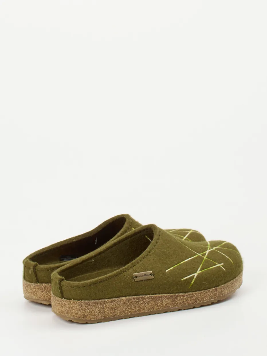An kühlen Tagen bietet dieser olivgrüne Filzpantoffel mit ergonomischem Kork-Latex-Fußbett eine ideale Entspannungslösung für zu Hause. Gefertigt aus filziger, reiner Schurwolle bleibt das Fußklima angenehm ausgeglichen. Die offene Ferse erleichtert das Hineinschlüpfen, während kontrastfarbene Stickereien und ein Metall-Logo dezente Akzente setzen. Die strukturierte Gummisohle sorgt für Trittsicherheit auf allen Untergründen. Inspiriert von alpiner Gemütlichkeit und dem Trend zu Naturmaterialien, ergänzt dieses Modell mühelos loungewear-orientierte Looks.