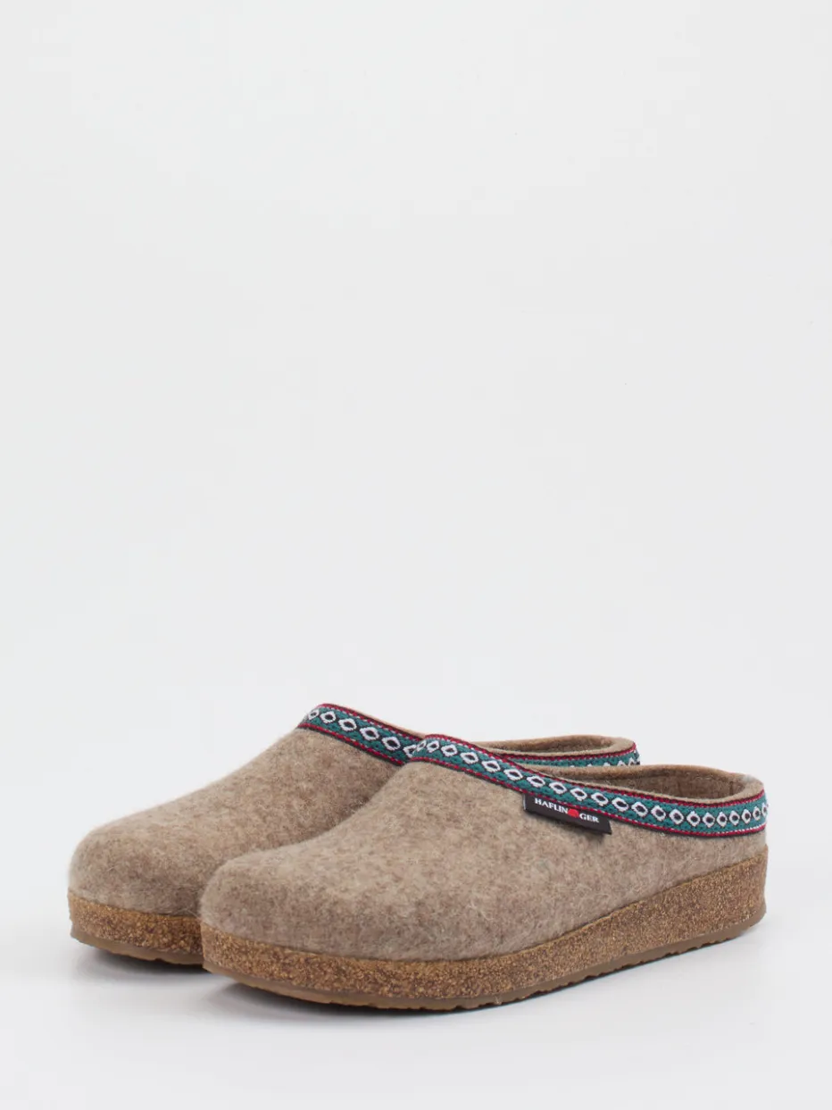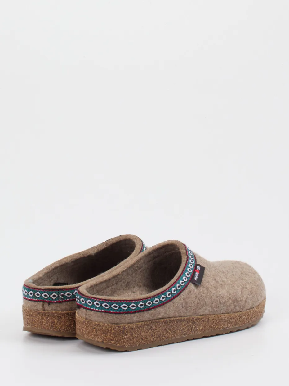 Natürlich, warm und stilvoll zugleich.Die Marke Haflinger präsentiert mit diesen Filzpantoffeln ein gemütliches Modell für zuhause. Ideal für ruhige Momente daheim sorgen das Obermaterial aus filzartigem Schurwollfilz und das ergonomische Korkfußbett für natürlichen Komfort und nachhaltige Qualität. Das beigebraune Design mit petrolgrüner und dunkelroter Ethno-Bordüre verleiht dem Modell einen alpinen Charakter. Dank offener Ferse und rutschhemmender Gummilaufsohle überzeugt der Schuh auch funktional. Inspiriert vom Slow-Living-Trend ist er besonders für komfortorientierte Trägerinnen und Träger geeignet. Kombiniert mit Wollsocken oder einem weichen Fleeceanzug entsteht ein stimmiger Look. Ein Klassiker im Zeichen von Qualität und Naturverbundenheit.