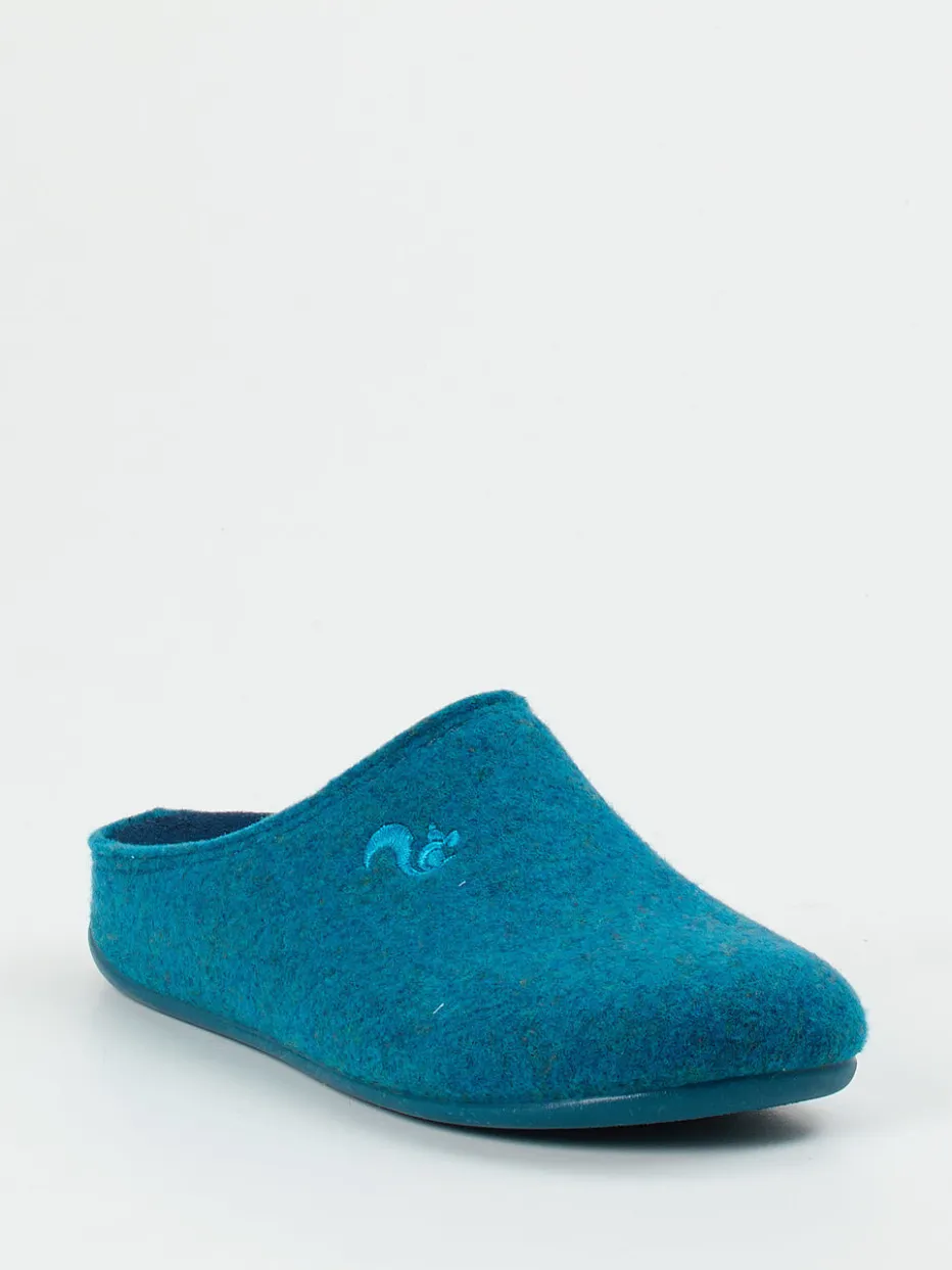 Wohlfühlkomfort für entspannte Momente.Thies präsentiert mit diesem Modell ein Paar Filzpantoffeln für stilvolles Relaxen zu Hause. Die geschlossene Vorderkappe und die ergonomisch geformte, gepolsterte Innensohle aus recyceltem Filzmaterial bieten Komfort und Stabilität. Der petrolblaue Farbton verleiht dem minimalistischen Design eine moderne Note, unterstützt durch die tonale Stickerei auf dem Obermaterial. Die offene Fersenpartie im Clog-Stil sorgt für schnelles Hineinschlüpfen, während die rutschhemmende Gummisohle sicheren Halt auf glatten Böden gewährleistet. Skandinavische Designeinflüsse treffen hier auf den Trend „Quiet Luxury“. Ein bewährter Winterklassiker mit nachhaltigem Anspruch und durchdachtem Tragekomfort.