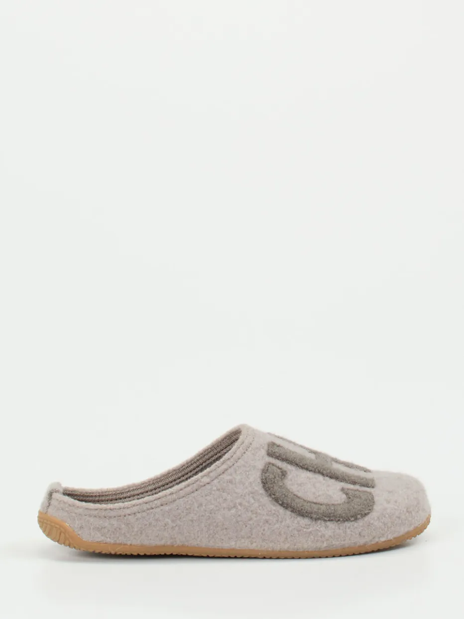 Ideal für entspannte Stunden daheim bieten die Pantoletten aus gewalkter Schurwolle ein besonders weiches Tragegefühl. Der filzige Wollfilz reguliert Temperatur und Feuchtigkeit, während die profilierte Gummisohle sicheren Halt auf glatten Böden verspricht. Optisch punktet das Modell mit hellgrauer Farbgebung, offener Fersenpartie im Mule-Stil und markentypischem „CHILL“-Lettering in Ton-in-Ton-Optik. Inspiriert von Loungewear-Trends fügt sich das Design nahtlos in entspannte Looks ein – vom Fleece-Set bis zu Kuschelsocken.