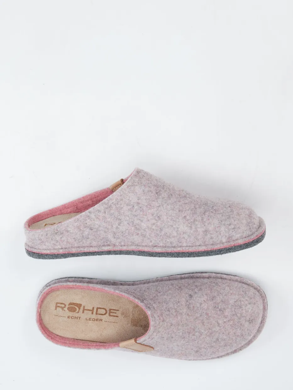 Minimalistisch gemütlich für kalte Tage.Rohde präsentiert mit diesen Hausschuhen eine stilvolle Kombination aus Naturmaterialien und ergonomischem Komfort. Ideal für ruhige Stunden zu Hause sorgen die offenen Filzpantoffeln in meliertem Rosagrau für wohlige Wärme. Hergestellt aus hochwertigem Wollfilz mit samtweicher Haptik, unterstützt eine ergonomisch geformte Echtleder-Innensohle den natürlichen Stand. Die klassische Silhouette mit anthrazitfarbener Laufsohle bietet durch ihre gummierte Unterseite optimalen Halt. Dezente Details wie ein naturfarbener Lederpatch mit Logoprägung unterstreichen die zurückhaltende Formsprache. Inspiriert vom skandinavischen Wohnstil, passen sie hervorragend zu Loungewear in Naturtönen. Rohde kombiniert langlebige Qualität mit stilvollem Komfort für den Alltag daheim.
