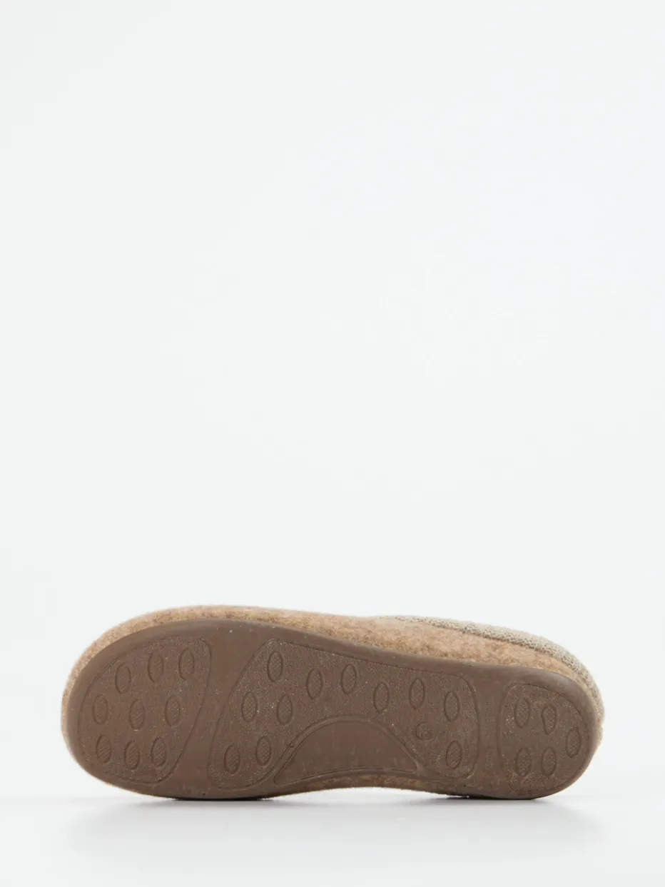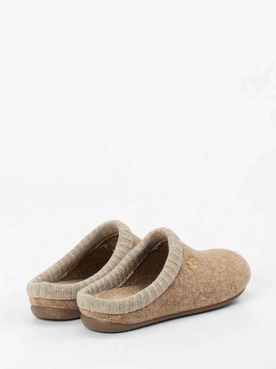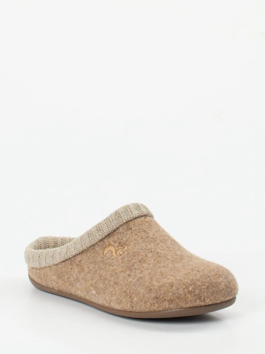 Wärmender Komfort für kalte Tage.Thies präsentiert bequeme Filzpantoffeln aus hochwertigem Wollfilz für entspannte Stunden Zuhause. Ob beim morgendlichen Kaffee oder an langen Winterabenden: Diese Hausschuhe bieten dank beige-braunem Wollfilz ein angenehm wärmendes Tragegefühl. Die filzige Oberfläche wirkt atmungsaktiv und naturbelassen, der gestrickte Schaftrand ergänzt harmonisch die offene Clog-Form. Eine rutschhemmende Gummisohle sorgt für sicheren Halt in jedem Raum. Die dezente Ton-in-Ton Stickerei unterstreicht den skandinavisch inspirierten Look – ideal für alle, die es unkompliziert und stilvoll mögen. Ein langlebiger Wohlfühlklassiker mit nachhaltiger Materialgabe.