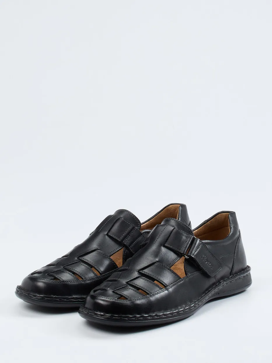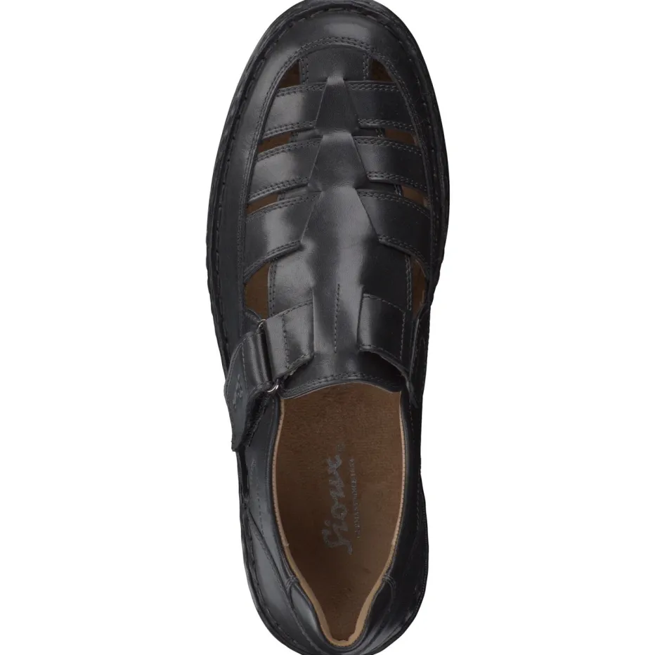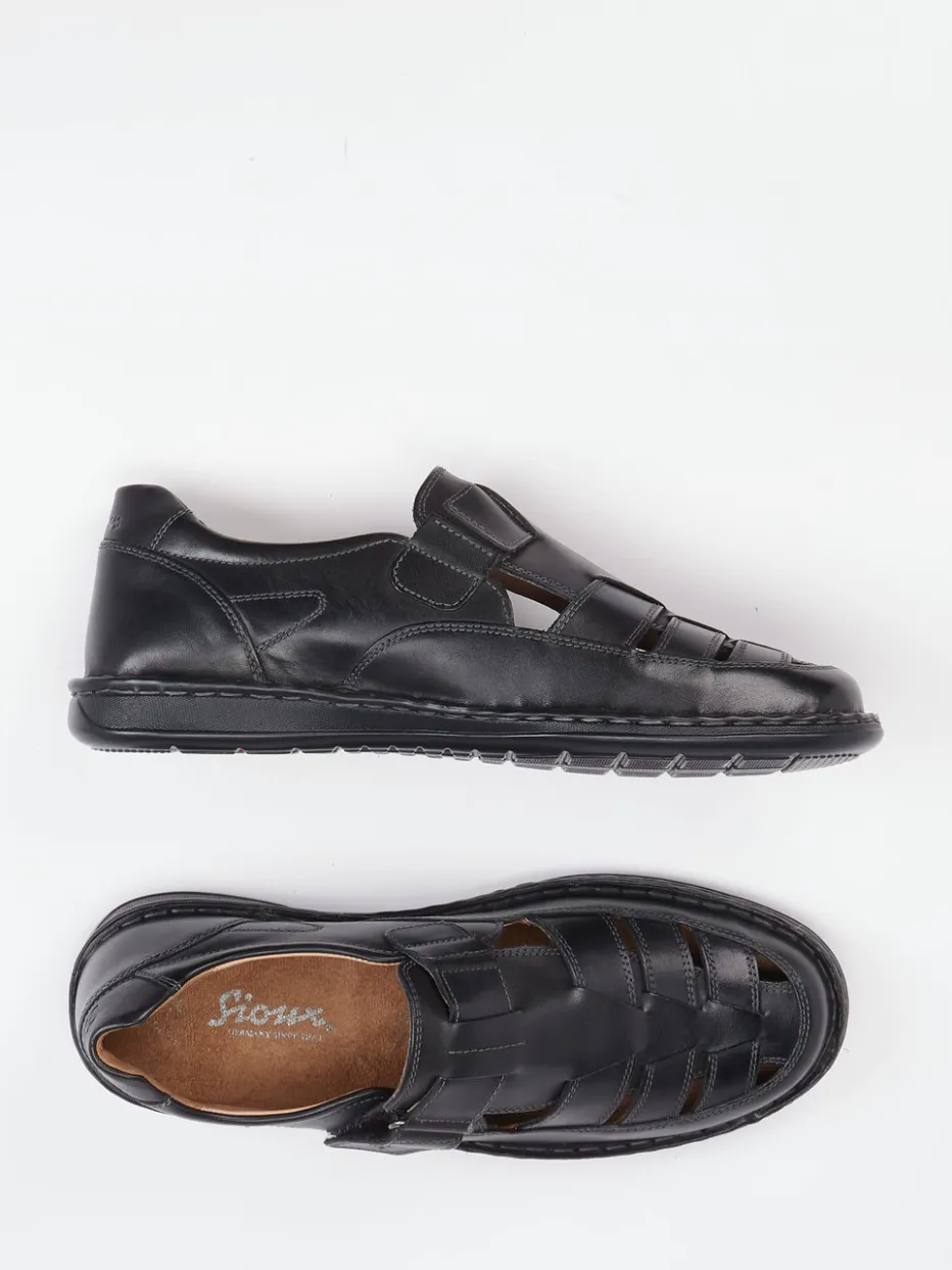 Sommerkomfort für stilvolle Klassiker.Die Marke Sioux präsentiert mit diesem Herren-Fischermokassin einen vielseitigen Begleiter für Alltag und Reise. Der aus schwarzem Kalbleder gefertigte Schuh zeigt eine glänzende Oberfläche und verfügt über ein tonales Nahtbild sowie eine geprägte Logo-Applikation auf dem breiten Klettverschluss. Cut-Outs sorgen für angenehme Belüftung, während Lederfutter und eine velourslederbezogene, ergonomisch geformte Decksohle den Tragekomfort erhöhen. Die flexible Gummisohle gewährt sicheren Halt – auch auf sommerlichen Ausflügen. Inspiriert von minimalistischer Funktionalität mit einem Hauch 90er-Jahre-Flair, passt er ideal zu Leinenhosen und monochromen Looks. Ein komfortstarker Sommerschuh mit dezenter Vintage-Note aus dem Hause Sioux.