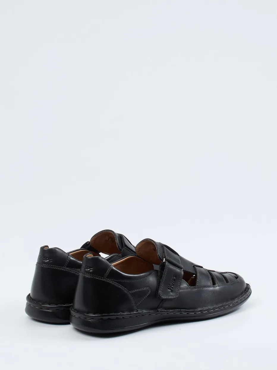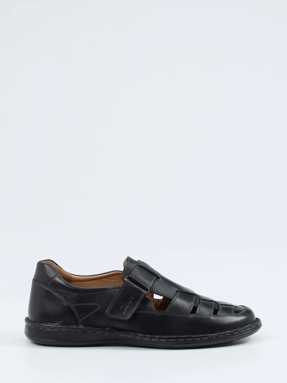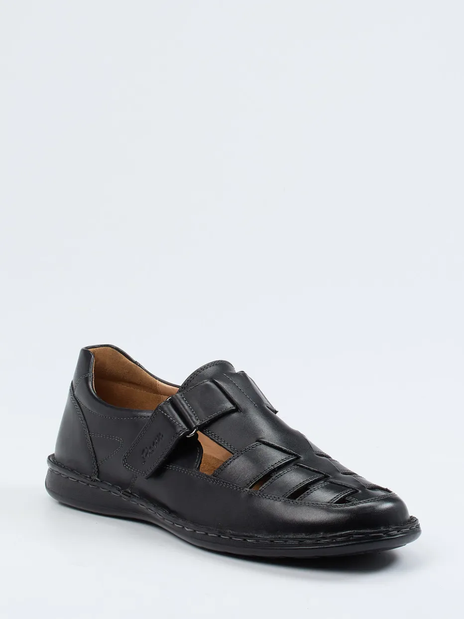 Sommerkomfort für stilvolle Klassiker.Die Marke Sioux präsentiert mit diesem Herren-Fischermokassin einen vielseitigen Begleiter für Alltag und Reise. Der aus schwarzem Kalbleder gefertigte Schuh zeigt eine glänzende Oberfläche und verfügt über ein tonales Nahtbild sowie eine geprägte Logo-Applikation auf dem breiten Klettverschluss. Cut-Outs sorgen für angenehme Belüftung, während Lederfutter und eine velourslederbezogene, ergonomisch geformte Decksohle den Tragekomfort erhöhen. Die flexible Gummisohle gewährt sicheren Halt – auch auf sommerlichen Ausflügen. Inspiriert von minimalistischer Funktionalität mit einem Hauch 90er-Jahre-Flair, passt er ideal zu Leinenhosen und monochromen Looks. Ein komfortstarker Sommerschuh mit dezenter Vintage-Note aus dem Hause Sioux.