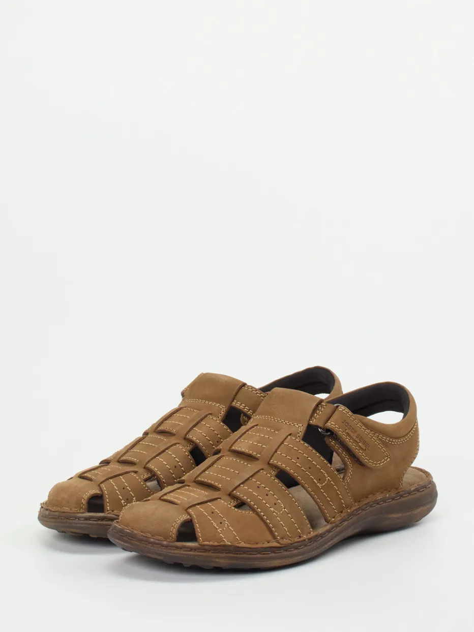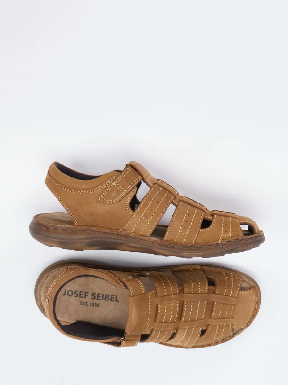 Sommerkomfort mit jeder Bewegung.Josef Seibel präsentiert diese bequemen Herren-Fischersandalen mit atmungsaktiver Machart. Ob beim Stadtbummel oder auf Reisen – die geschlossene Zehenpartie schützt, während das cognacfarbene Fettleder mit seiner matten, samtigen Oberfläche edel wirkt. Beige Kontrastnähte, ein geprägtes Markenlogo am Klettverschluss und eine flexible Gummisohle mit Profil unterstreichen den durchdachten Freizeitanspruch. Innen sorgt ein weich gepolstertes Textilfutter für Atmungsaktivität. Die offen gehaltene Fersenpartie steigert den sommerlichen Komfort. Kombiniert mit Leinenhose oder Poloshirt ergibt sich ein entspannter Urlaubslook. Ein ehrlicher Freizeitschuh mit Fokus auf Passform und hochwertigen Materialien.