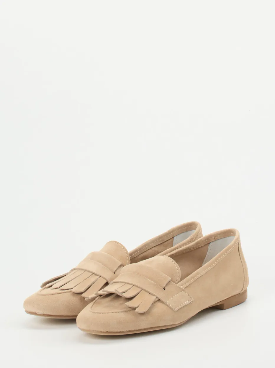 Für Büro oder Stadtbummel gleichermaßen geeignet, besticht das Modell durch sein hochwertiges Veloursleder, das samtig angeschliffen einen dezenten Mattglanz erzeugt. Die flache Silhouette wird durch eine Fransenapplikation mit Zierlasche und Ton-in-Ton-Nähten akzentuiert. Ein flexibler Kunststoffboden mit flachem Blockabsatz rundet den Komfort ab. Die Beige-Nuance passt ideal zu sommerlichen Nuancen und unterstützt den Clean-Chic à la Quiet Luxury – perfekt für Fans von Preppy- und Minimalismus-Looks.