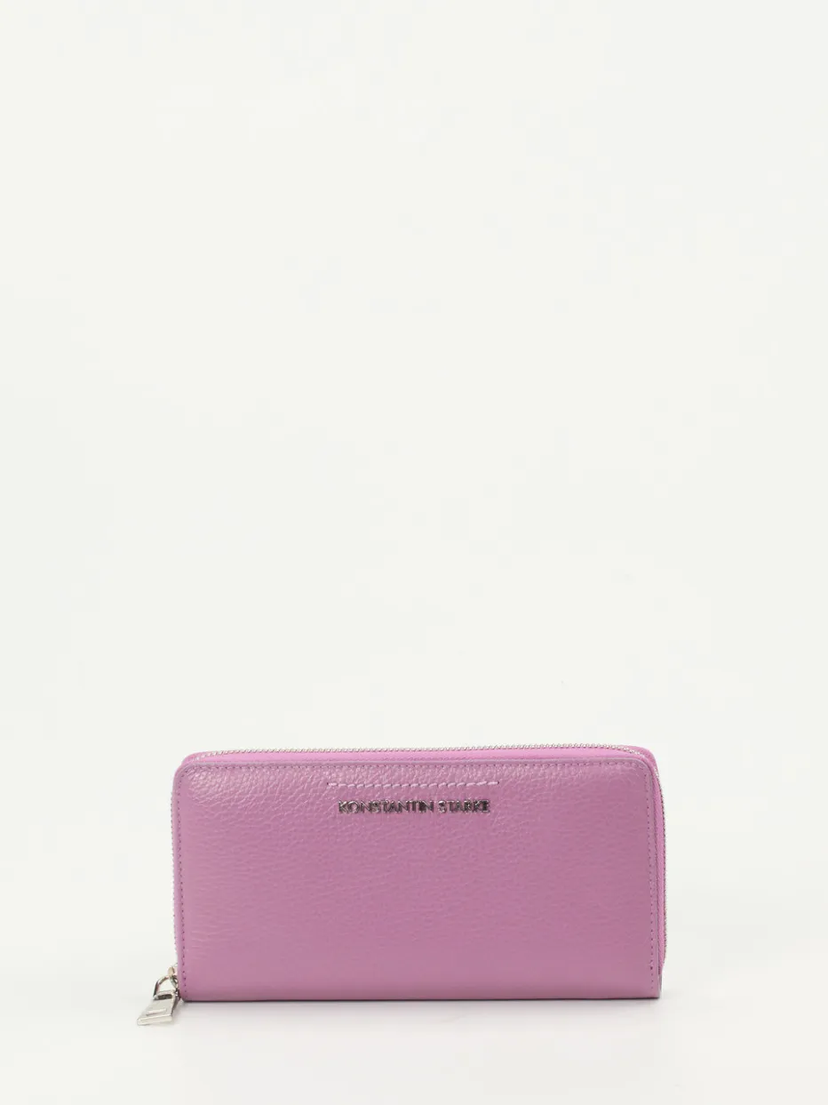 Die Geldbörse überzeugt mit strukturiertem Kalbleder in zartem Flieder und durchdachter Innenaufteilung – ein stilvolles Accessoire für Alltag und Büro.