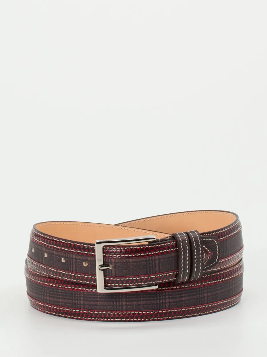 Fein gearbeitetes Druckleder mit Karomuster und akzentuierenden roten Nähten verleiht dem Gürtel von Harris einen markanten Heritage-Charakter. Die silberfarbene Schließe rundet das Design stimmig ab.