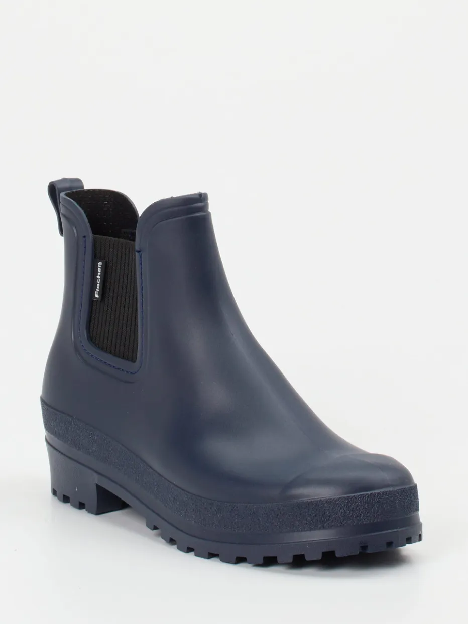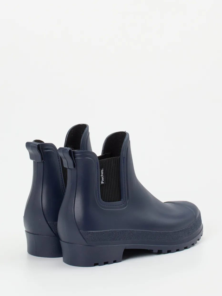 Stilvoll durch nasse Tage.Fischer präsentiert mit dieser Gummistiefelette eine wetterfeste Lösung im Chelsea-Stil. Ideal für feuchte Straßen und urbane Spaziergänge: Der marineblaue Synthetik wirkt durch das matte Finish modern und unaufdringlich. Die elastischen Einsätze und die hintere Zuglasche erleichtern das An- und Ausziehen, während die profilierte Gummisohle rutschfesten Halt bietet. Dank textiler Fütterung bleiben die Füße angenehm warm. Das knöchelhohe, rund geformte Modell greift die Trends „Quiet Outdoor“ und „Functional Footwear“ stilsicher auf. Perfekt kombinierbar mit Regenmantel und urbaner Outdoorwear. Robuster Komfort im minimalistischen Design mit funktionalem Anspruch von Fischer.