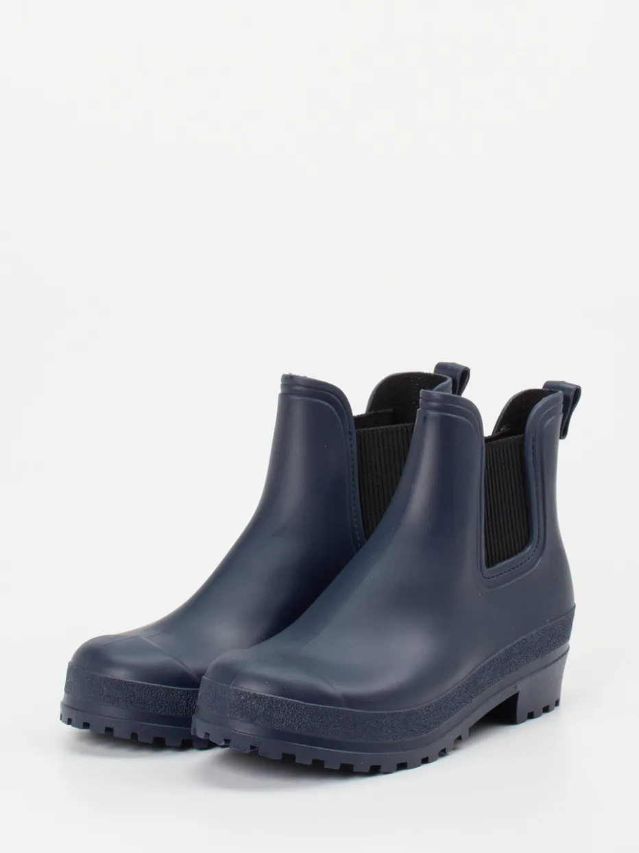 Diese pflegeleichte Gummistiefelette überzeugt durch wasserdichtes Finish und dezent profilierte Laufsohle – funktional und stilsicher bei Regenwetter.