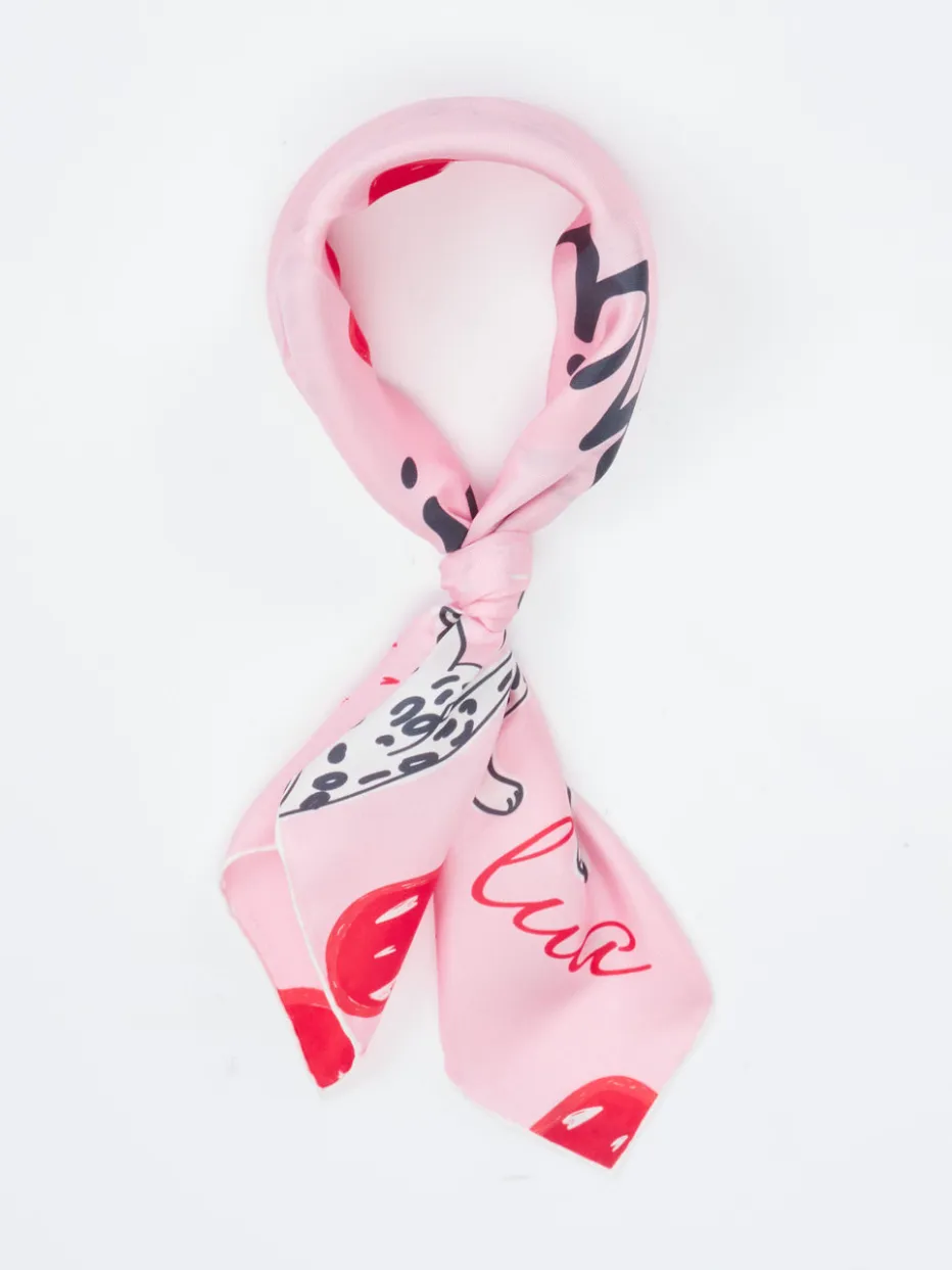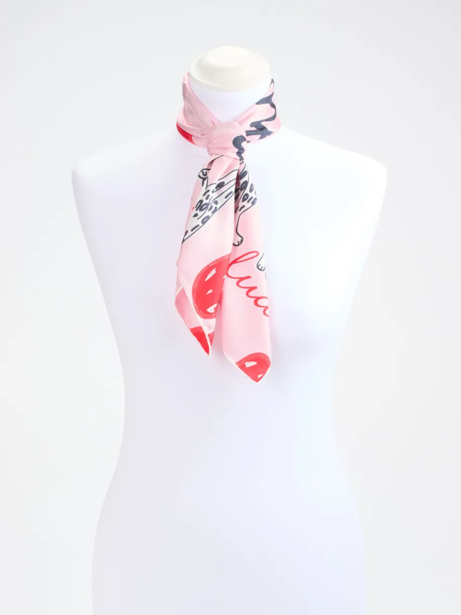 Dieses quadratische Halstuch aus Seide verbindet verspielte Illustrationen mit luxuriösem Glanz – ideal für kreative Sommerstylings mit Persönlichkeit.