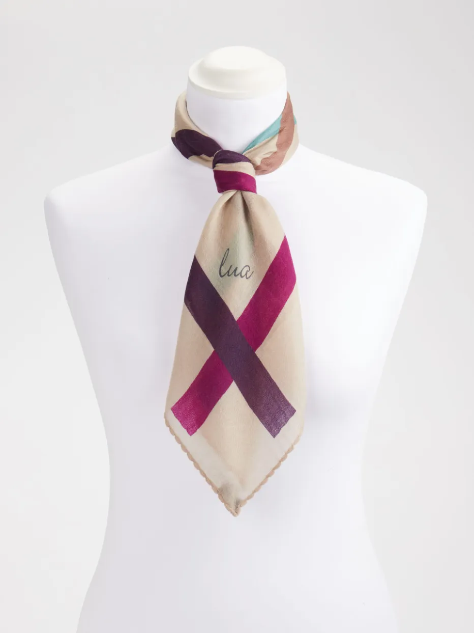 Frischer Akzent für stilvolle Outfits. Lua Accessories präsentiert dieses karierte Halstuch für Damen. Ob als farblicher Blickfang im Büro oder als raffiniertes Accessoire beim Stadtbummel – das quadratische Tuch überzeugt durch seine matte Oberfläche und das dezente Logo. Das Material besteht aus angenehm weicher, atmungsaktiver Wolle. Farbige Blockstreifen in Türkis, Pflaume und Braunrot werden von Cremebeige kontrastiert und betonen die klare Dreiecksilhouette. Inspiriert vom Color-Blocking-Trend und dem Stil der 90er Jahre, ordnet sich das Modell charmant in einen minimalistischen Look ein. Ein wandelbares Accessoire mit dezentem Statement – ideal für schlichte, hochwertige Garderoben.