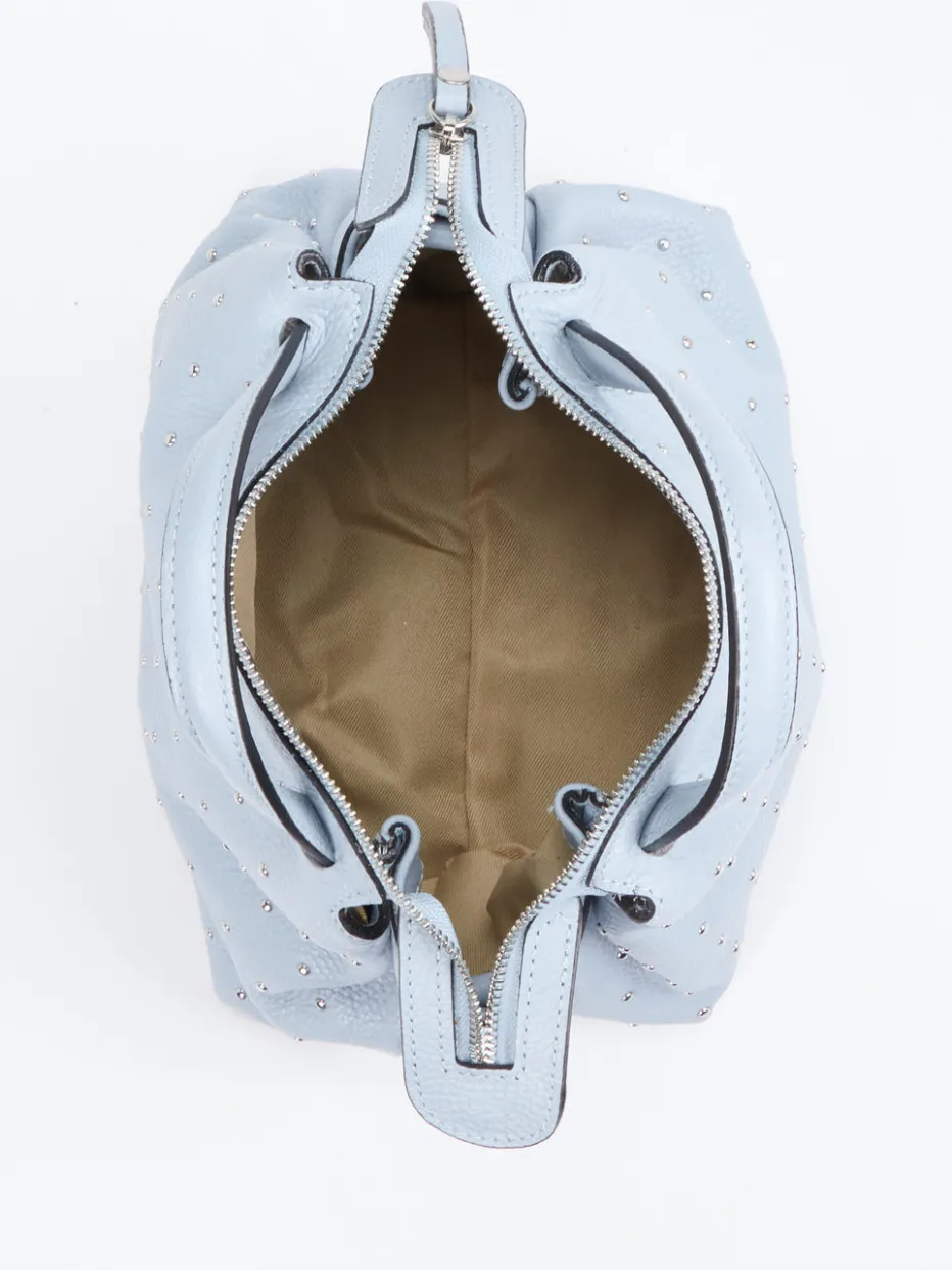 Diese attraktive Umhängetasche wird von der italienischen Marke Marlon Firenze vorgestellt. Hellblaues Kalbleder zeigt mit seiner natürlichen Narbung eine attraktive Struktur. Zum Hingucker werden die silberfarbenen Nieten, die dem Look eine besondere Note verleihen. Der Innenraum bietet genügend Platz für Ihre wichtigsten Utensilien. Bei Bedarf kann der elegante Schulterriemen abgenommen werden. Ein Accessoire, das Sie stilvoll überall hin begleitet! – Material: Kalbleder – Farbe: Blau – Größe: 18 x 26 x 15 cm (H x B x T) – Schulterriemen: ca.120 cm abnehm- und verstellbar – Verschluss: Reißverschluss – Innen: ein Reißverschlussfach