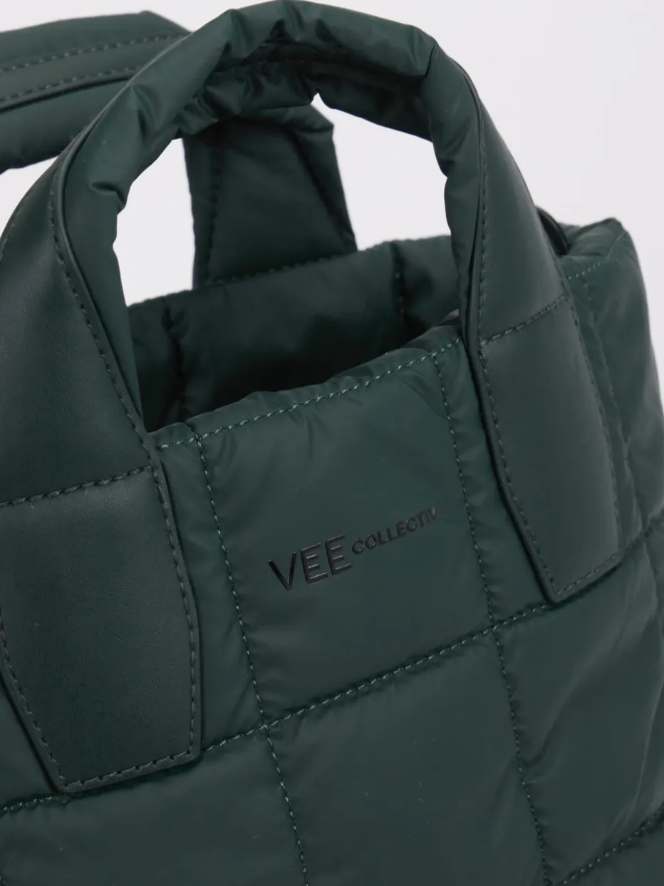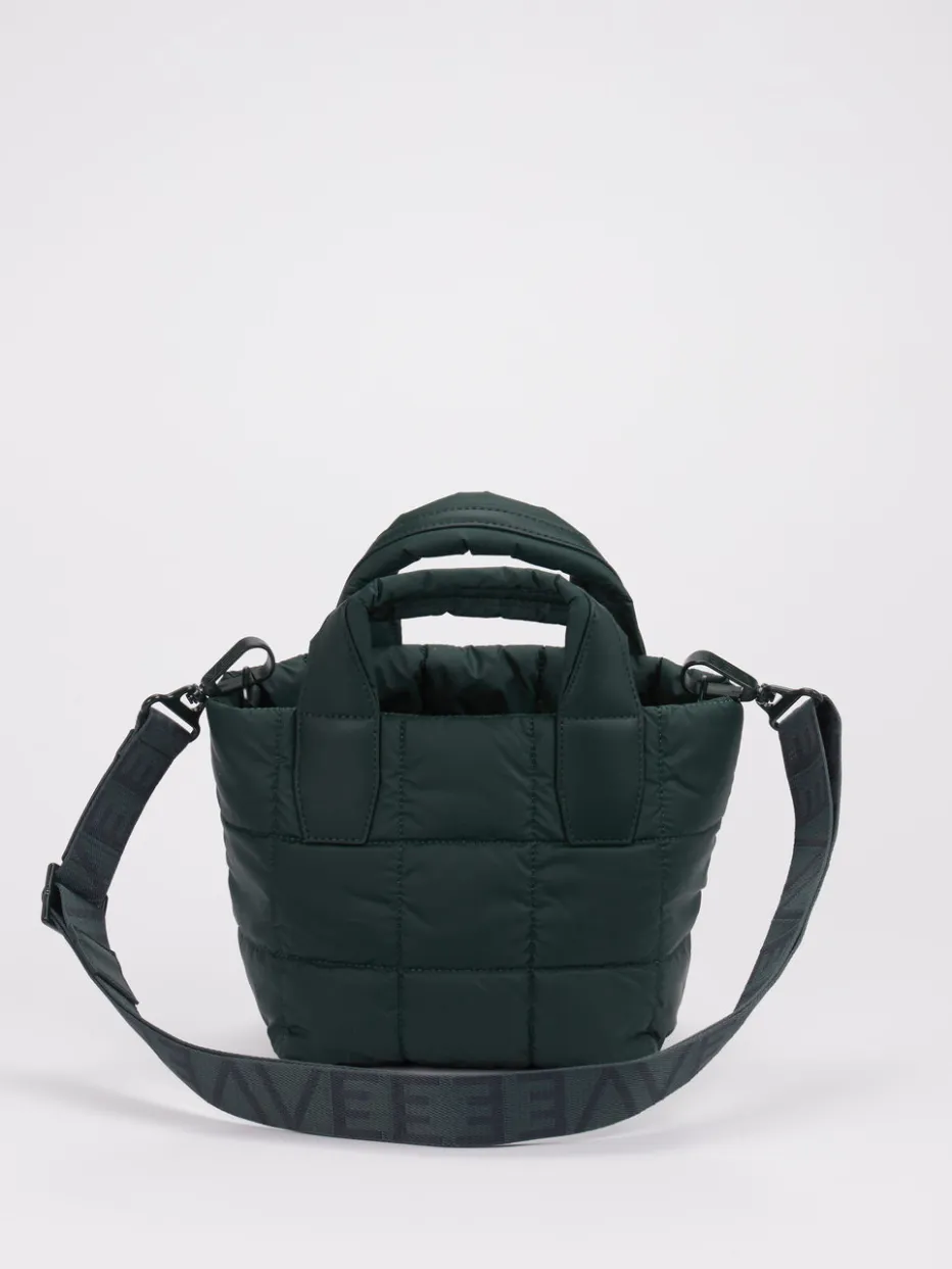 Minimalistisches Design trifft funktionalen Style: die Marke VeeCollective Berlin präsentiert mit dieser veganen Mini Tote Bag eine moderne Schulter- und Umhängetasche für Damen. Perfekt für entspannte Alltagsmomente bietet die gesteppte Tasche aus mattem Nylon in sattem Tannengrün ein stilvolles Update urbaner Freizeitlooks. Die rechteckige Silhouette mit abgerundeten Kanten wird durch gepolsterte Tragehenkel, einen breiten Schulterriemen mit Logowebung und tonale Steppnähte ergänzt. Praktische Details wie ein Innenkarabinerband, ein leichtgängiger Reißverschluss und das federleichte Gewicht runden die Funktion ab. Die Optik folgt aktuellen Trends wie „Quiet Utility“ und „Padded Bags“. Wasserabweisend, minimalistisch im Look – moderner Komfort mit Style-Bewusstsein.