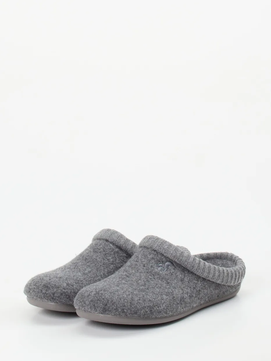 Die Marke Thies präsentiert einen klassischen Hausschuh in Clog-Form für gemütliche Stunden daheim.