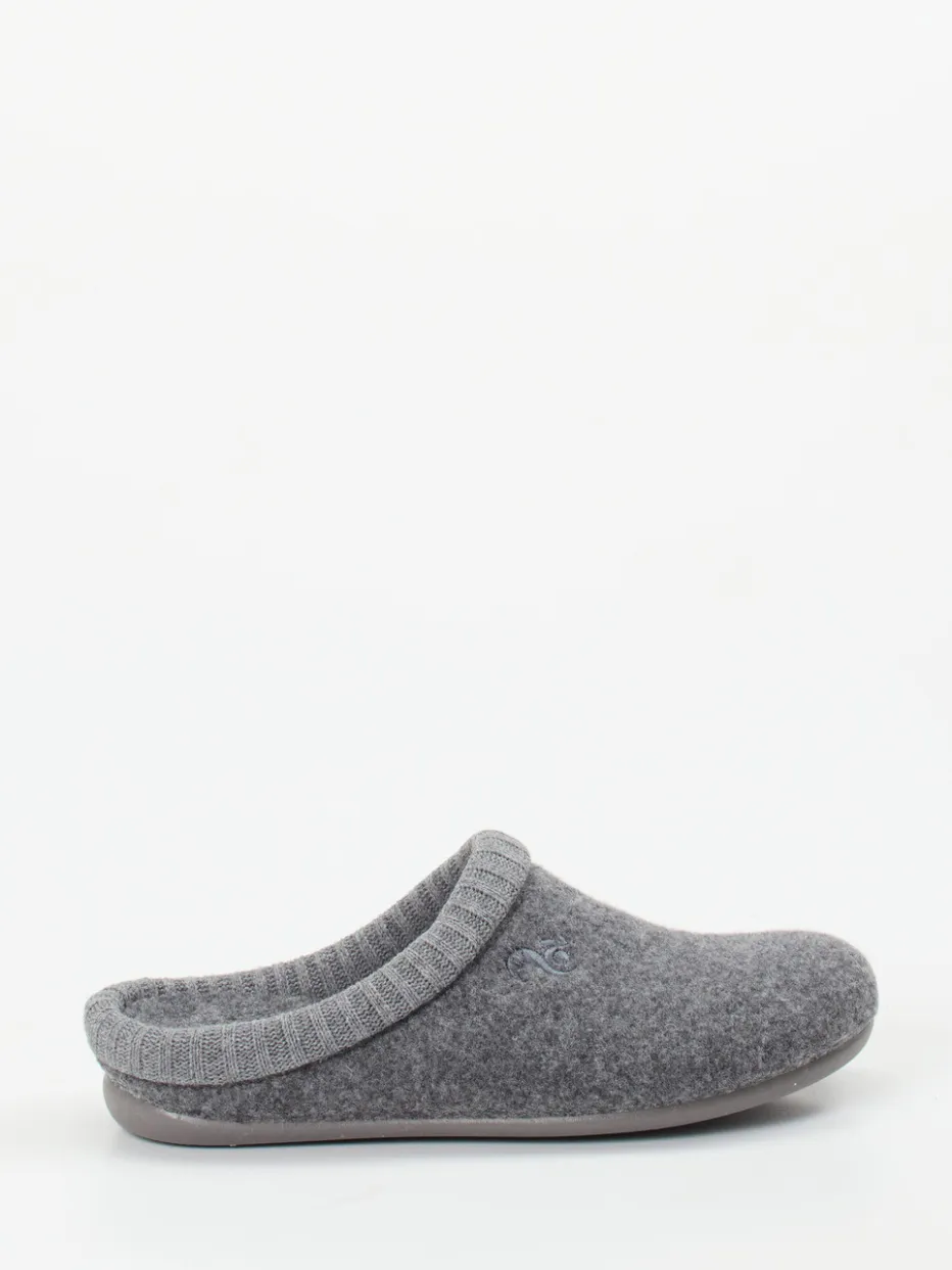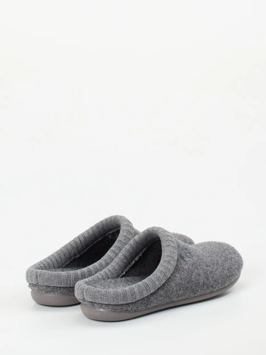 Aus hochwertigem Filz gearbeitet, zeigt das Modell in Mittelgrau eine filzige Textur mit subtiler Ton-in-Ton-Stickerei. Der gerippte Strickrand optimiert die Passform, während die ergonomische Gummisohle sicheren Halt bietet. Die farbliche Zurückhaltung und schlupffreundliche Verarbeitung wirken stilvoll und funktional zugleich – passend zum „Coziness Core“-Trend der Saison. Ein unkomplizierter Partner zu Loungewear und Heimtextilien.