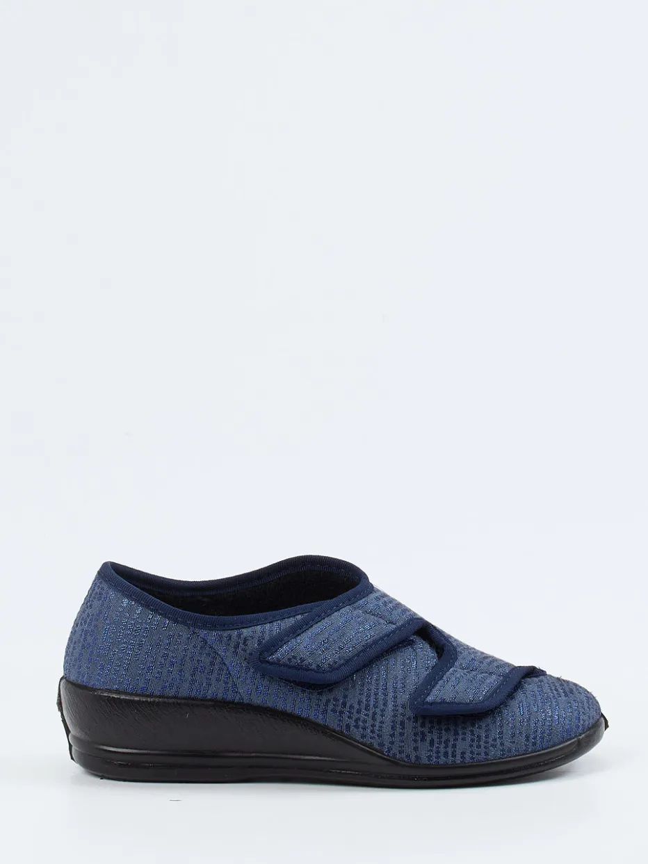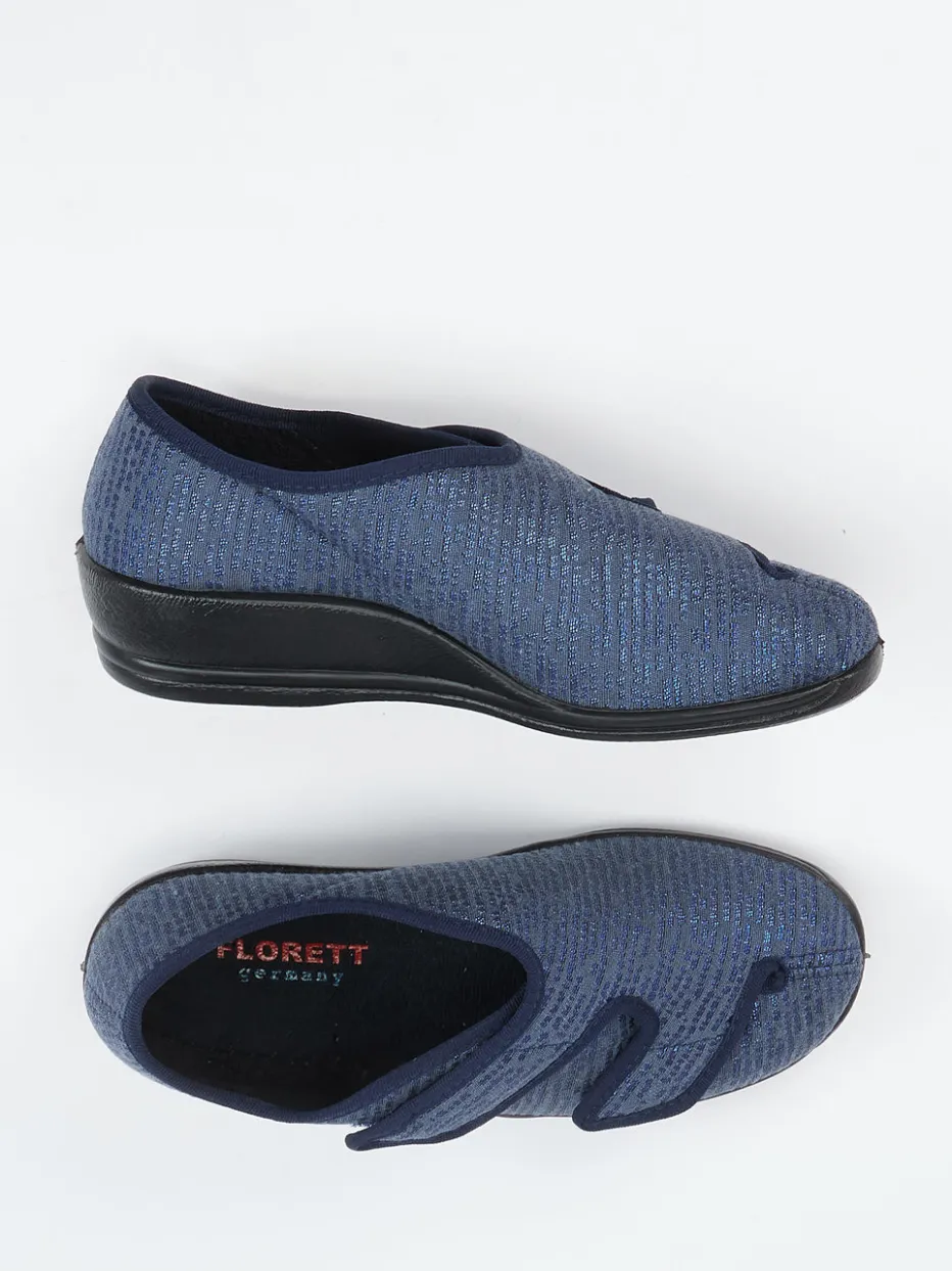 Viel Komfort für entspannte Momente.Dieser Damen-Hausschuh aus der Florett-Kollektion von Varomed überzeugt mit durchdachter Ergonomie für zuhause und den Alltag. Das strukturierte, dunkelblaue Textil mit leicht glänzender Oberfläche verleiht ihm eine moderne Anmutung. Zwei breite, verstellbare Klettverschlüsse ermöglichen individuellen Halt, während eine ergonomische PU-Sohle für Trittsicherheit sorgt. Das atmungsaktive Frottee-Futter sorgt für ein gutes Fußklima – ideal für Komfortliebhaberinnen. Dank Weite H ist auch bei stärkerem Fußvolumen ein angenehmes Tragegefühl gewährleistet. Funktionalität und praktischer Stil vereinen sich hier zu einem alltagstauglichen Wohlfühlschuh. Pflegeleicht und bequem – typische Varomed-Qualität für zuhause.