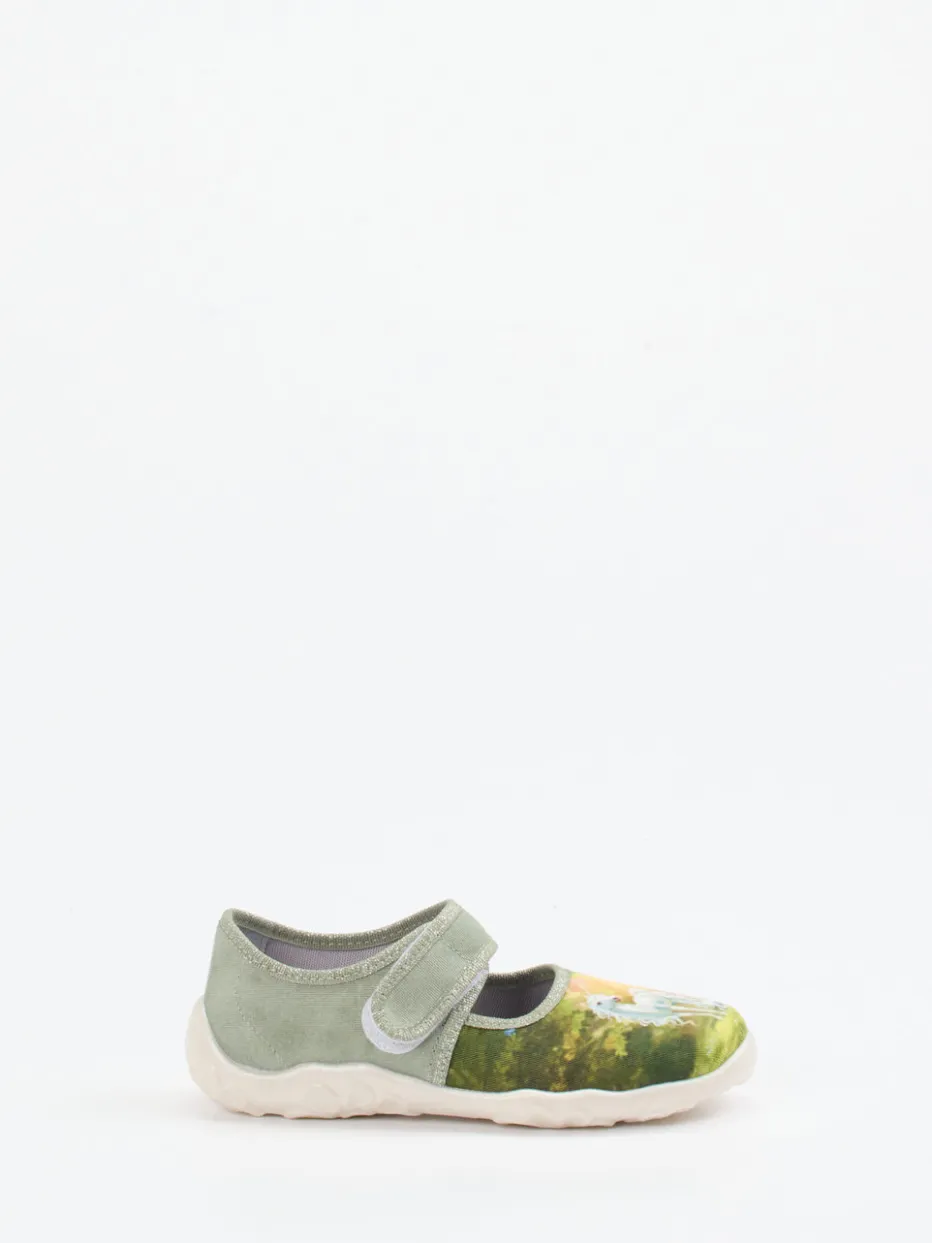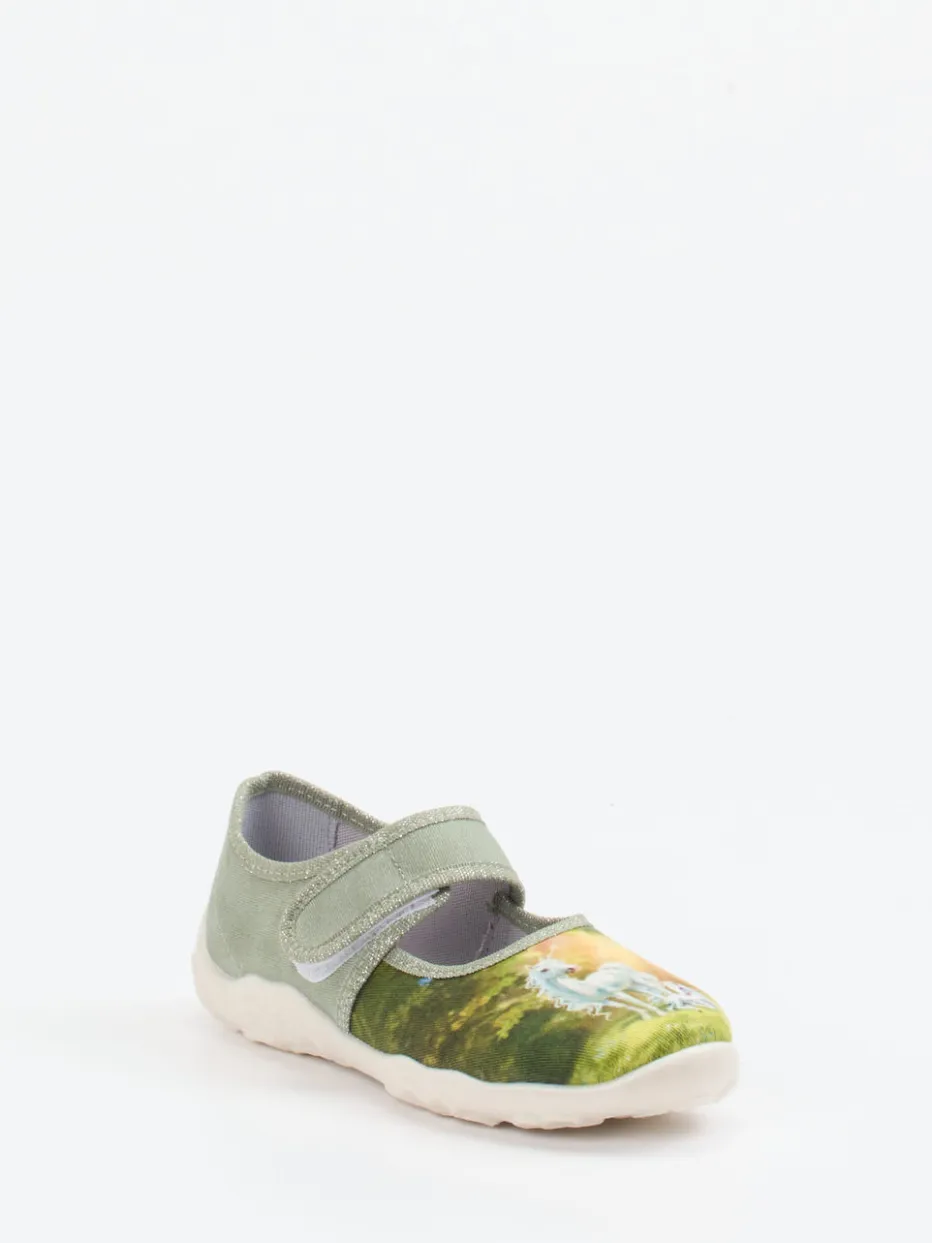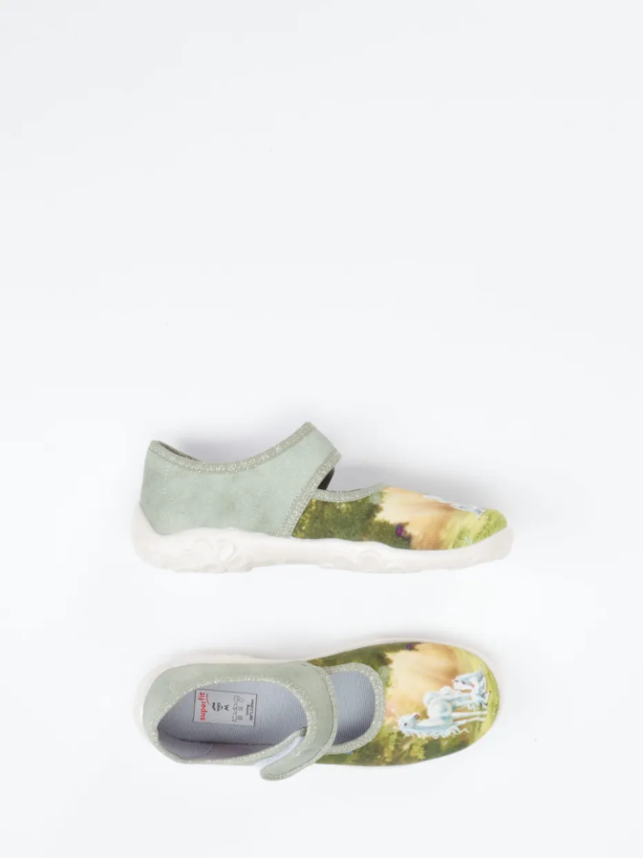 Verspieltes Design für kleine Entdecker.Superfit präsentiert einen komfortablen Kinderhausschuh in klassischer Ballerinaform. Ob zu Hause oder im Kita-Alltag – der Kletthausschuh erfüllt den Wunsch nach bequemen und sicheren Bewegungen. Gefertigt aus grünem Textil mit samtigem Finish und zauberhaftem Einhorn-Fotoprint, wird er durch eine silberfarbene Einfassung und eine runde Silhouette ergänzt. Der Klettverschluss erleichtert das Anziehen, während die flexible PU-Sohle mit floraler Prägung sicheren Halt bietet. Märchenhafte Motive und kindgerechte Funktion verbinden sich zu einem verspielten Trendstück der Saison. Ideal zu Leggings und Hoodie im Einhorn-Look kombinierbar. Gekonntes Zusammenspiel von Komfort, Funktion und Fantasie zeichnet Superfit aus.