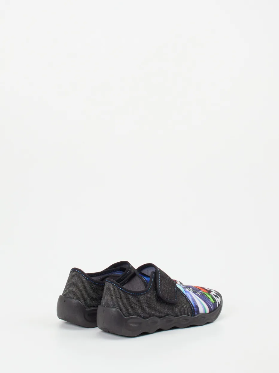 Spielbereit mit Stil.Superfit präsentiert diesen modischen Kinder-Hausschuh mit Klettverschluss. Ideal für wilden Spielspaß im Kinderzimmer: Der Hausschuh ist aus strapazierfähigem, weichem Textil gefertigt und zeigt sich in tiefem Schwarz mit farbenfrohem Rennwagen-Motiv auf dem Vorderblatt. Die rund geschnittene Silhouette mit stabilem Fersenbereich sorgt für Komfort und Halt, während die profilierte, perforierte Gummisohle rutschhemmend wirkt. Bunte Kontrastnähte und das Zielflaggenmotiv unterstreichen das lebendige Design – inspiriert vom Comic-Stil mit Streetwear-Flair. Besonders passend zu sportlichen Pyjamas und Loungewear. Superfit verbindet Funktionalität mit kindgerechtem Look für entspannte Stunden zu Hause.